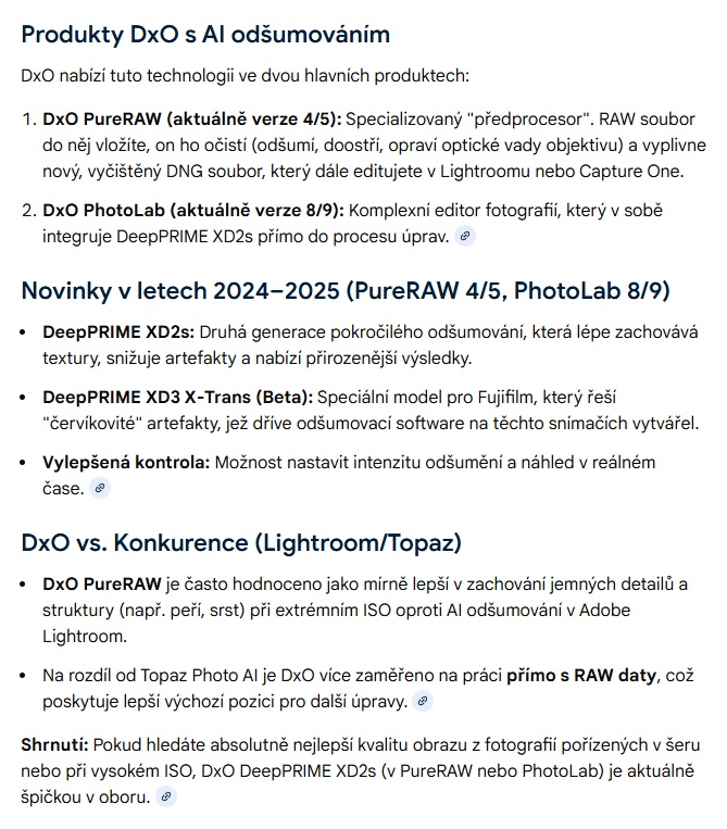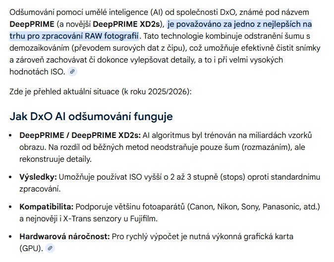 DxO bych řekl, že bude využívat taky nějaky AI odšumovací bazmeky, podobně jak aktuálně ACR v PS. Ten rozdíl oprotivá starším (teď nemyslím ZPS) odšumovacím algoritmům je propastný.