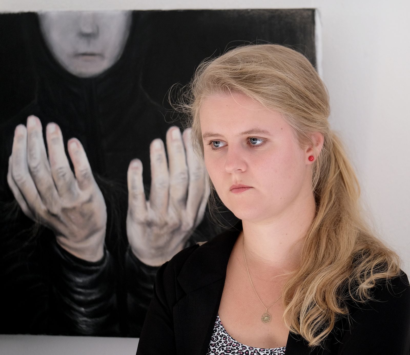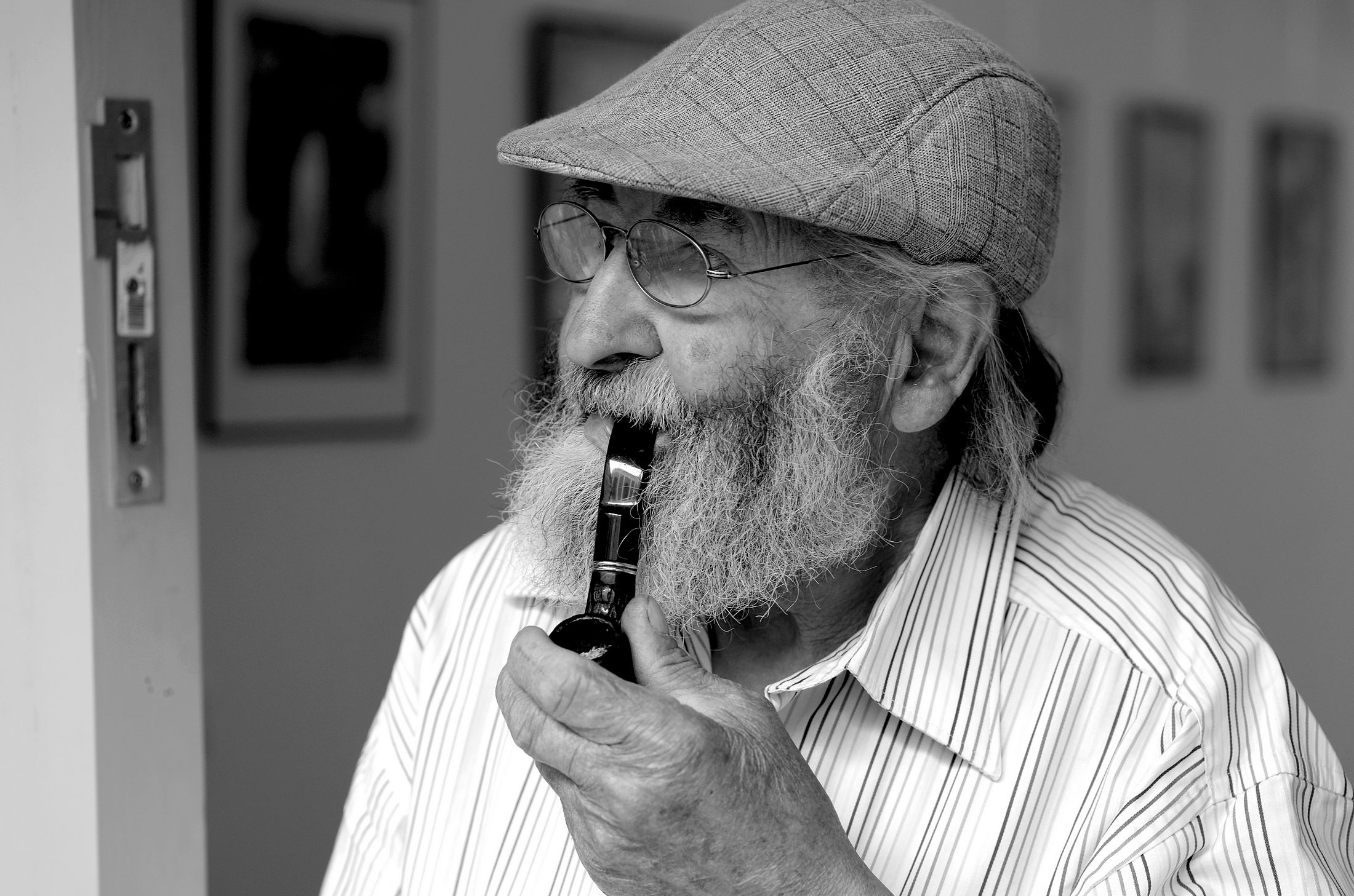 U tohoto portrétu je v první řadě zcela nezbytné odříznout ze snímku tu zárubeň vlevo. A potom bych taky odstranil ten poslední obraz vpravo. Čili dva svislé řezy.