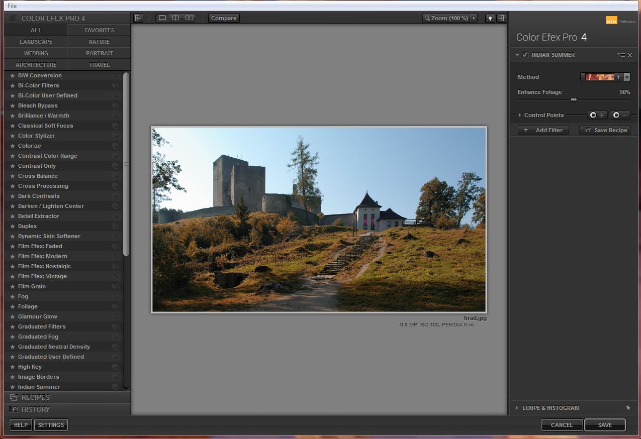 Color efex Pro má tak velkou škálu přednastavených ,,efektů", že je má dokonce rozdělené do podskupin ,,podle vhodnosti" : krajina, svatba, portrét , architektura a další.. Jedním klikem ,,předělat" letní fotku do podzimu a nebo z jasného počasí do mlhy je docela zábava :D , ale jak už jsem psal dříve...s rozmyslem a méně bývá více ;)