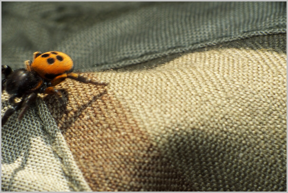 Když to viděl fotografický pánbůh tak se nade mnou asi smiloval a dneska mi na Rané konečně ,,přihrál" do cesty jednoho Stepníka :D . JENŽE to jsem netušil, jak to malé jednocentimetrové škvrně dokáže být hrozně čilé a ještě navíc neúnavné ( inu jde mu o sex tak se snaží najít partnerku (n) ). V trávě se vůbec nedalo fotit a když se mi ho konečně podařilo z prstu ( je jedovatější než Zápřednice , ale nemá důvod tak nic neudělá ) přendat alespoň na klobouk, tak jsem ho nestačil různě přetáčet a obracet jak metelil :D .Protože je mrňavý, tak jsem musel použít větší zvětšení ( tudíž menší hl.ostrosti a vyšší nárok na přesné zaostření )....jenže, v levačce klobouk s kterým musím rychle manipulovat , v pravačce foťák s vysunutým zoomem který se bez opory klepal jako osika ( levým okem sleduji kam právě Stepník běží abych mohl otočit klobouk a pravým se ho snažím najít v rozmazaném hledáčku s minimální hl. ostrosti ).....a navíc do toho na Rané vždy fouká silný nárazový vítr a cloumá s kloboukem ( Rubu s Jiříkem V. vědí o čem mluvím ) (y) (y) ....prostě to jinak dopadnout nemohlo :cry: