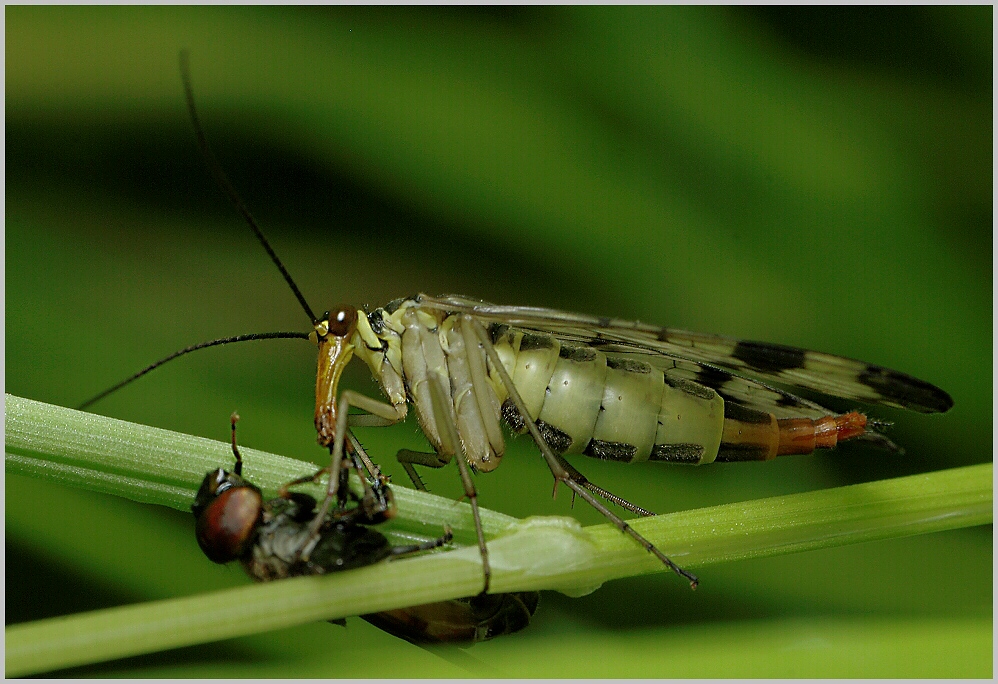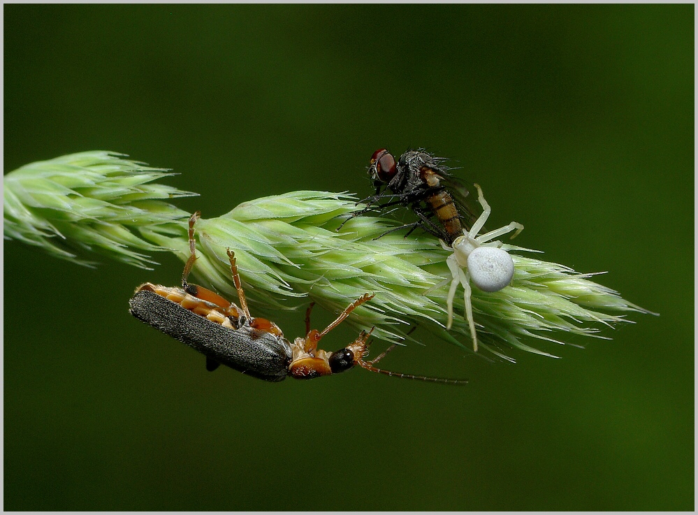 a na závěr fotka kterou si docela považuji....Běžník kopretinový ulovil mouchu a uviděl to Páteříček který na ni dostal zálusk, připlížil se po spodku trávy a pak na něj zaútočil a tahali se o ni....bohužel ta mela se vůbec nedala zaostřit a navíc docela dost foukalo :x . To už je druhý případ kdy jsem viděl jak se snaží Páteříček obrat malého pavouka o jeho kořist ....minule jsem cvakl i jak se o ni přetahují,ale bylo to 3 Mpx Fuji a na (ne)kvalitě je to vidět....tahle fotka z Pentíka je kvalitnější.
