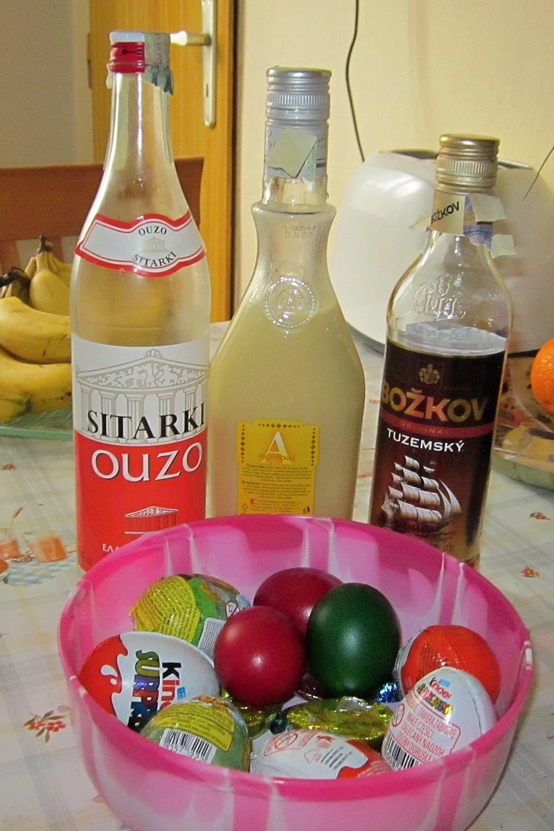 Tady tak pěkně nebylo. Tohle jste si mohli vymrskat. Teď to budu muset sníst sama. No, jedno véco už jsem snědla k večeři, když mám být na lačno. I ouza jsem popila, aby to mělo středomořskou atmosféru (bo Velikonoce jsou Středo a Mrtvo mořská záležitost. Ten zbytek rumu je ve vajáku, ředím to 1:1, aby se to dalo pít...