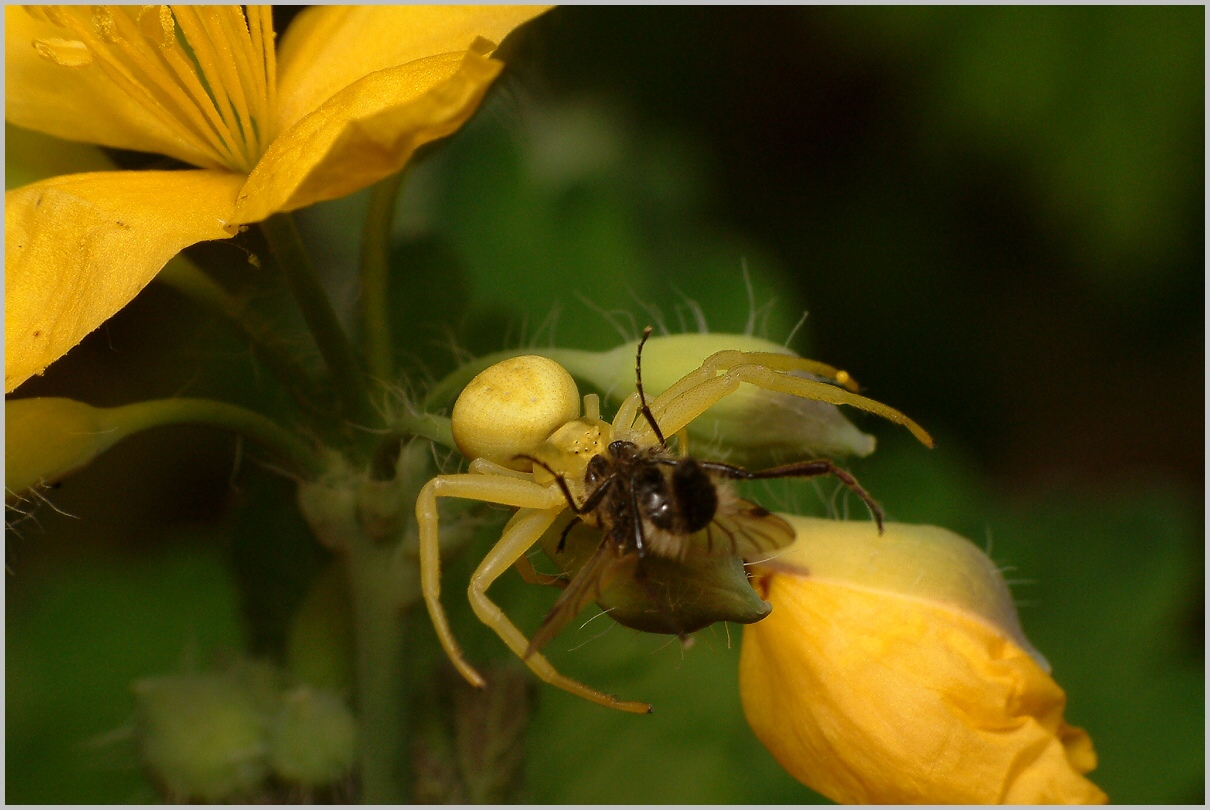 Tak ještě do třetice.... Ten Běžník kopretinový naprosto věrně napodobil barvu okvětních lístků Vlaštovičníku .Vůbec nebyl vidět když seděl v květu.....prozradila ho ta tiplice Jak uviděl objektiv a difuzér blesku tak se s ní pokoušel po kytce zdrhnout....to už měl ale smůlu...natáčel jsem si ho i s kytkou . Karlík