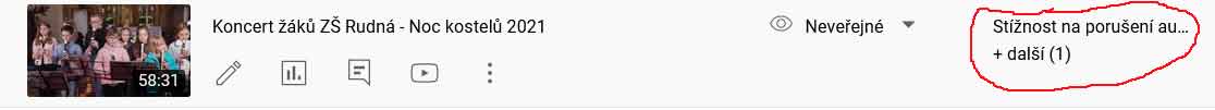A co se týká těch autorských práv, je to problém. Mám to z parkůrových závodů, kde také pouštějí muziku, kterou Youtube označí jako porušení autorských práv. Pak nezbývá, než to video dát jako neveřejné následně překlopit na veřejné. Zůstane tam ta věta "Stížnost na porušení autorských práv". A to i když náhodou děti na koncertě zpívaly či hrály některou ze soudobých skladeb.