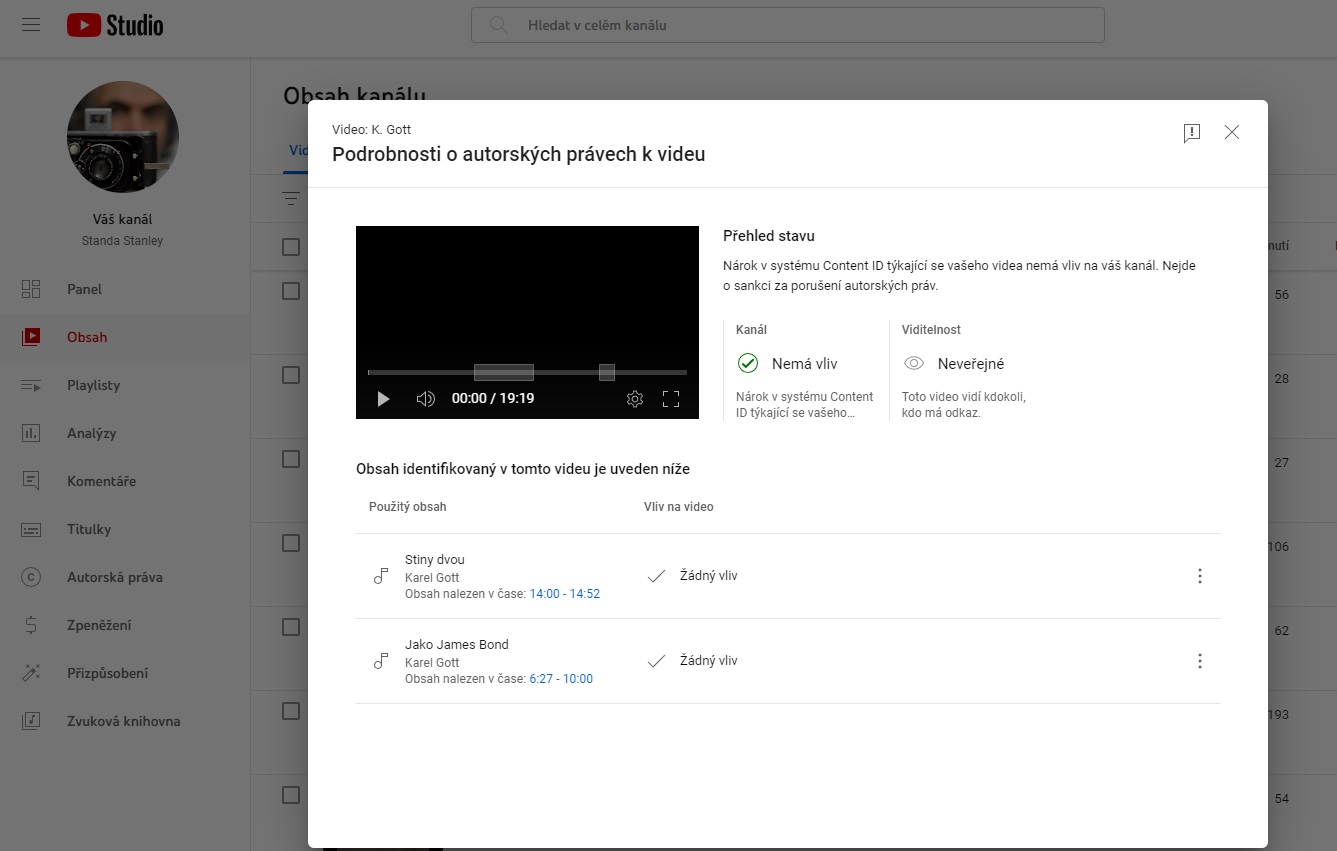 Koukám, že u jednoho videa mám "Stížnost na porušení autorských práv" a přitom je to můj záznam originál koncertu K.G.,