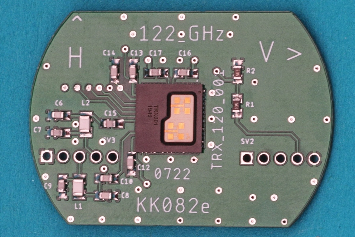 To je transvertor pro pásmo 122GHz, který slouží k vysílání a přijímání morze na několik desítek km. Ten čip s anténkou je originálně radarový čip, používaný pro auta k adaptivnímu tempomatu. Funguje do cca 125GHz, to zlaté jsou anténky. Je to řízené Arduinem Every (není na fotce, má víc paměti a jiný procesor než Arduino Nano).