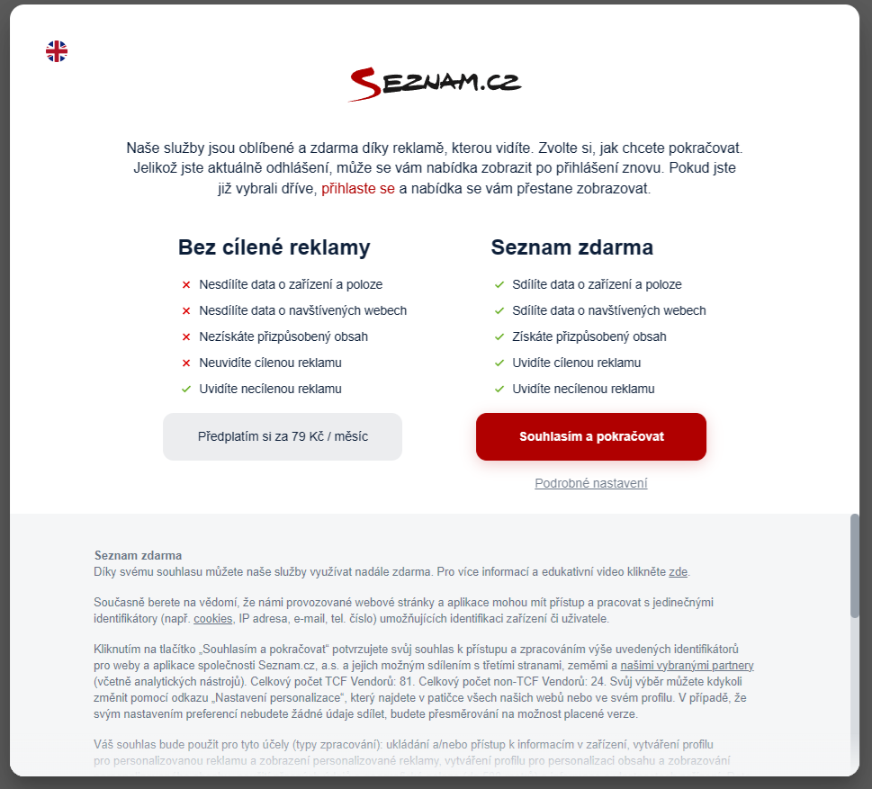 Nevím co. Asi proto, že Seznam mi nejede. Prostě furt mě nutí nastavit cookies, a když povolím jen nezbytny, tak mě nepustí přes další okno, kde není co zvolit, protože se nechci do Seznamu přihlašovat a jiná volba než přihlásit tam není.