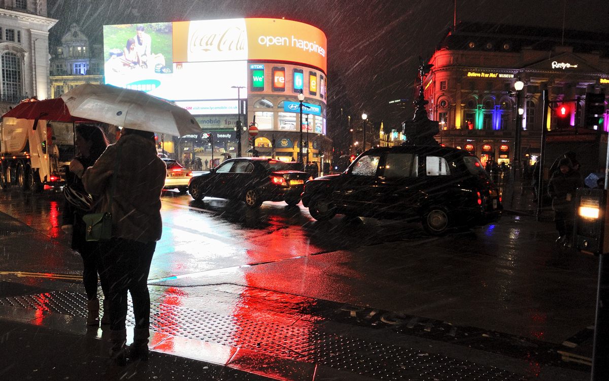 Dám večerní deštivý Piccadilly.