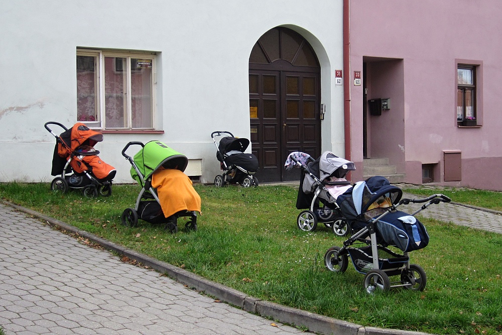 Zaparkovaná miminka, maminky "řádí" naproti v kavárně.