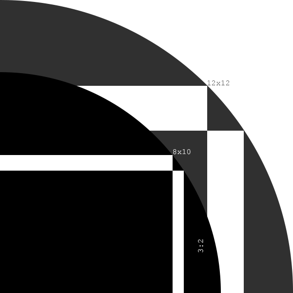 (části kružnice jsou tam vyznačeny kvůli úhlopříčce, kde teda obdelníky 3:2 mají stejnou úhlopříčku jako obdelník 8x10 a čtverec 12x12 u druhé kružnice, kružnice mají střed v levym dolním rohu)