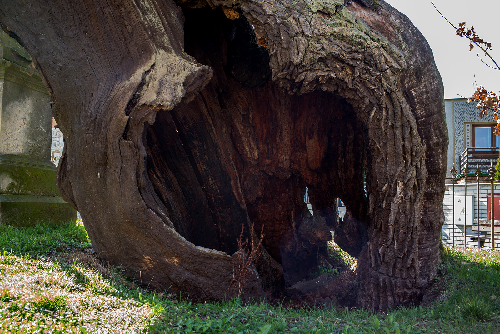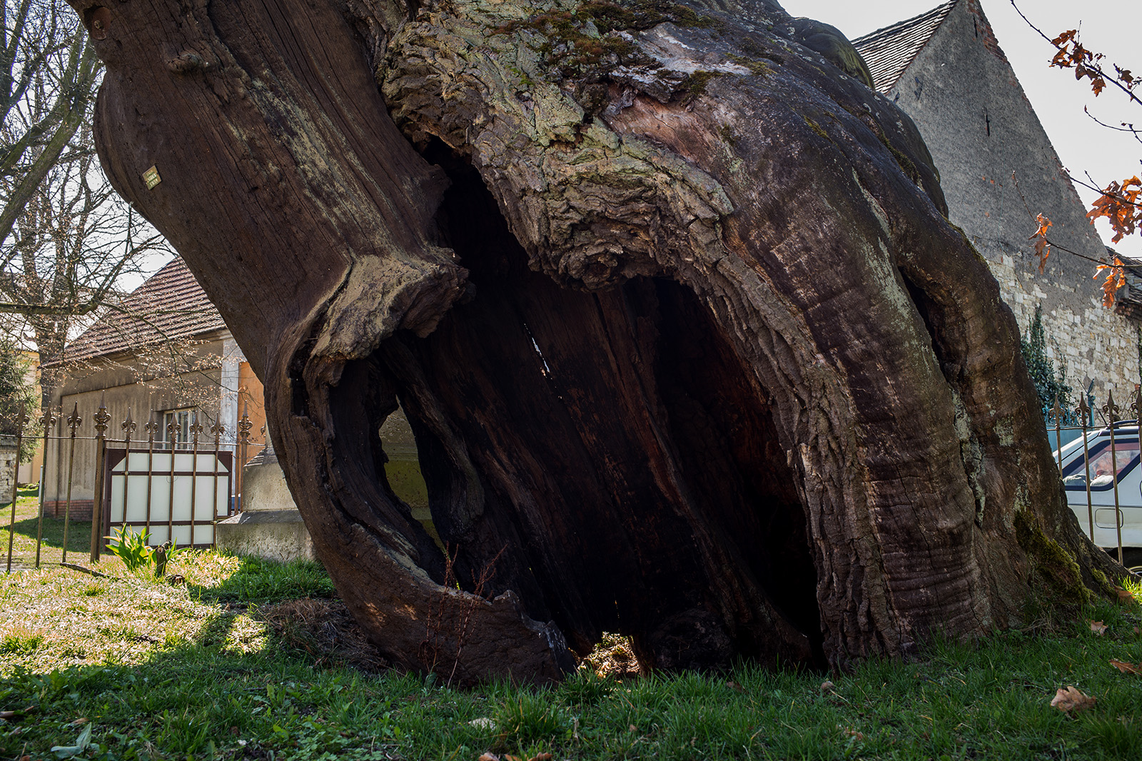 Na její parcelu je i ukotveno lano, které strom brání před rozlomením, vzala si tedy možná i proto za svou povinnost zbytek stromu opatrovat a chránit. Ochotně nás dovedla vrátky v oplocení až ke kmenu, abychom si opravdu ne něj mohli sáhnout.