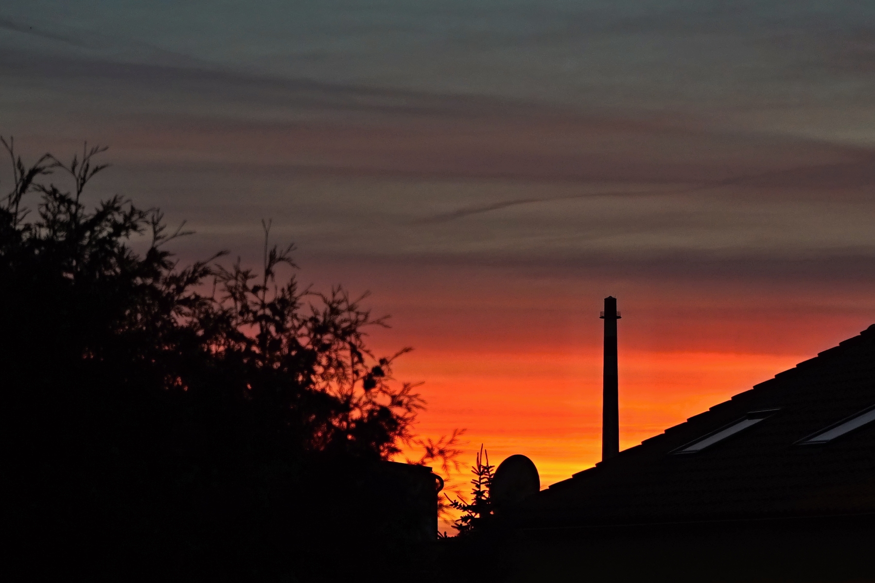 Včerejší západ Slunce. Bohužel mi tam zavazí ty túje, ale kdyby tam nebyly, tak by nebránily šíření smradu z kontejnerů z domova důchodců.