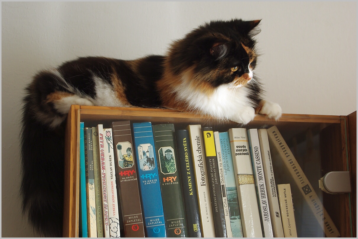 Fionka si vyskočila na knihovnu a se zájmem to pozorovala... Karlík PS: ,,Řekni mi co čteš a já ti povím jaký jsi"....tak to jsem zvědav co z toho mišmaše v knihovně o mně ,,odhalíte"