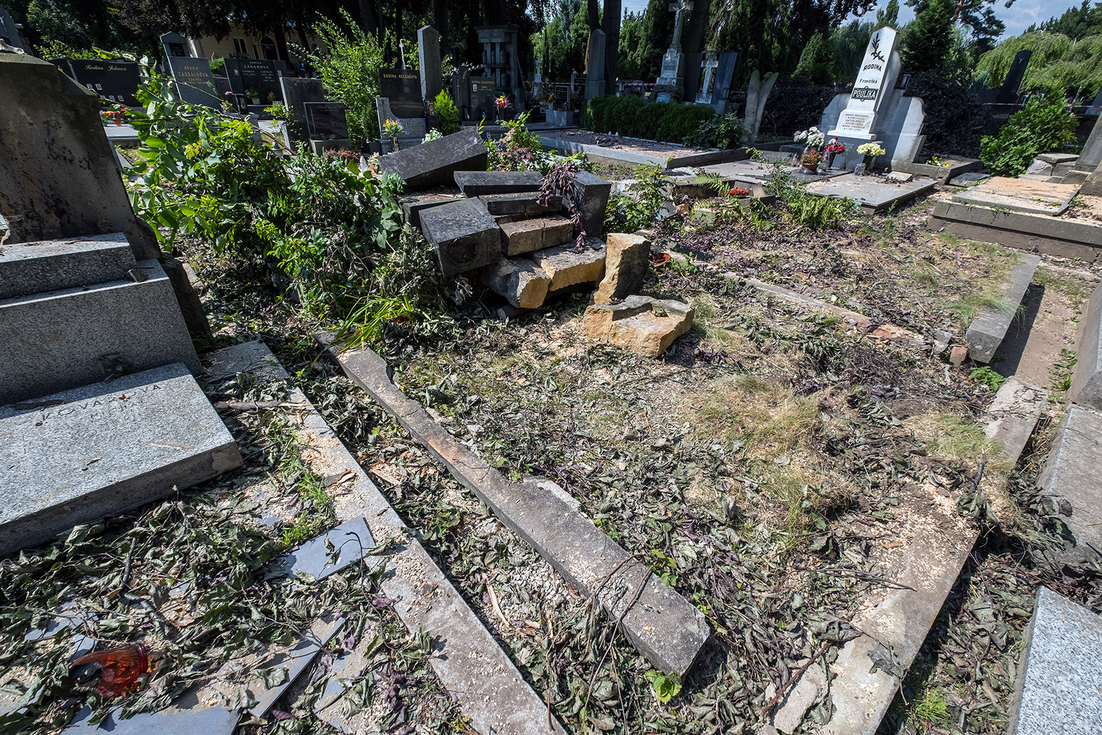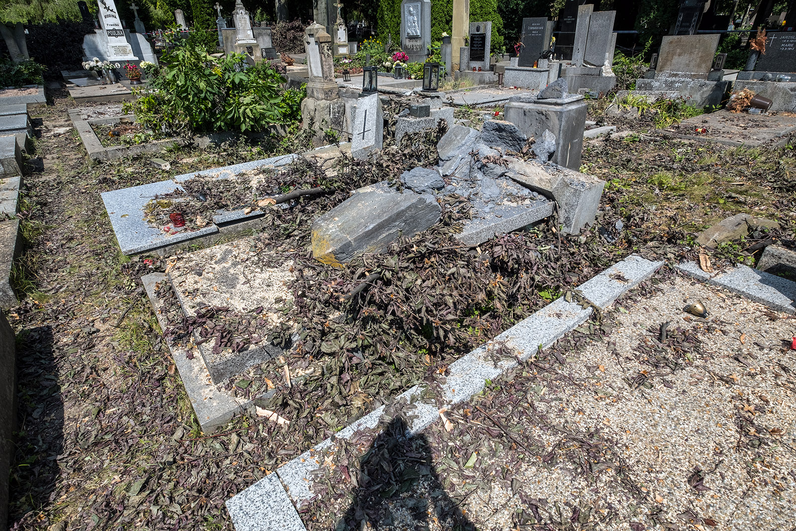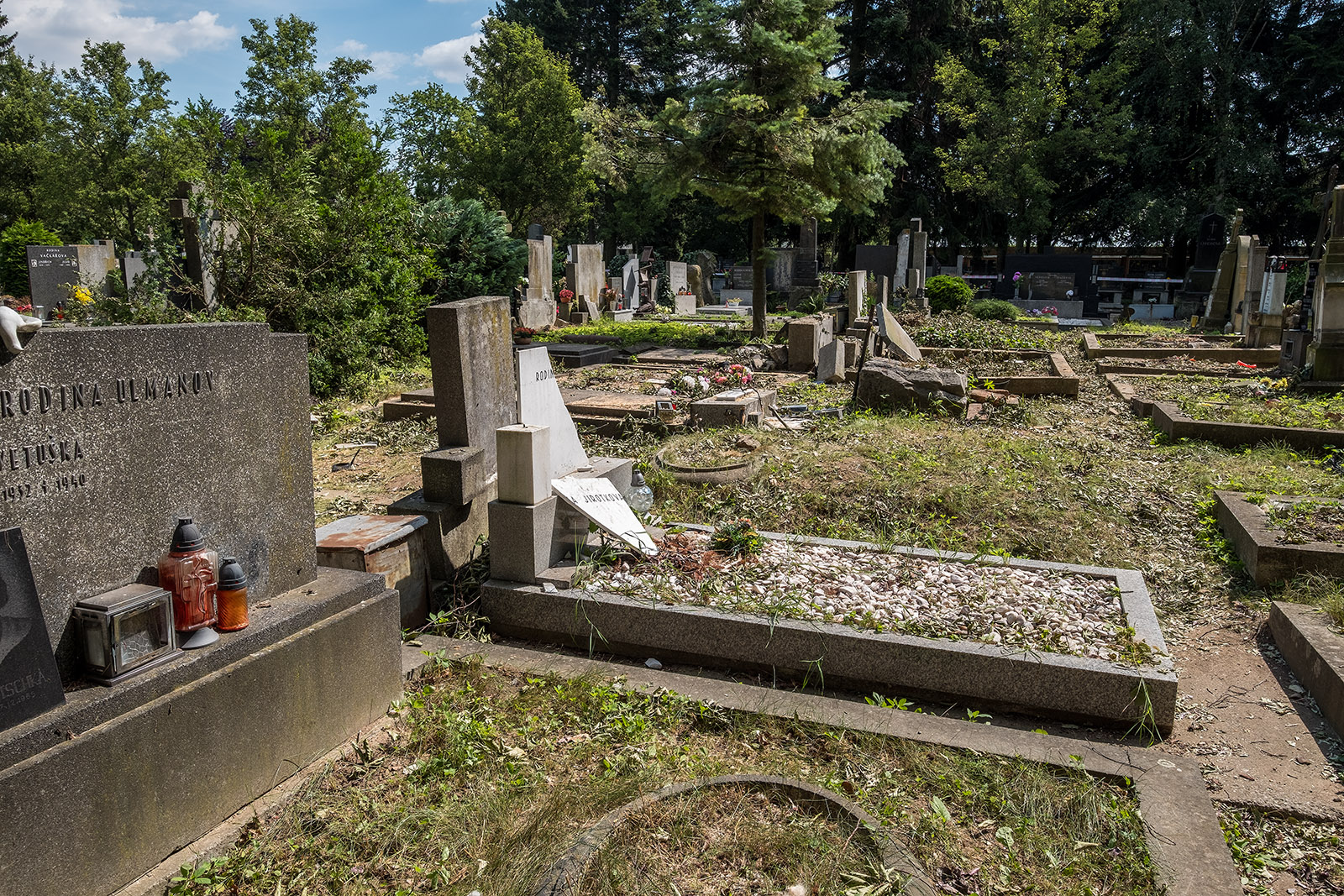 Prostějovský hřbitov po pondělním větru...popadané stromy už odvezli..