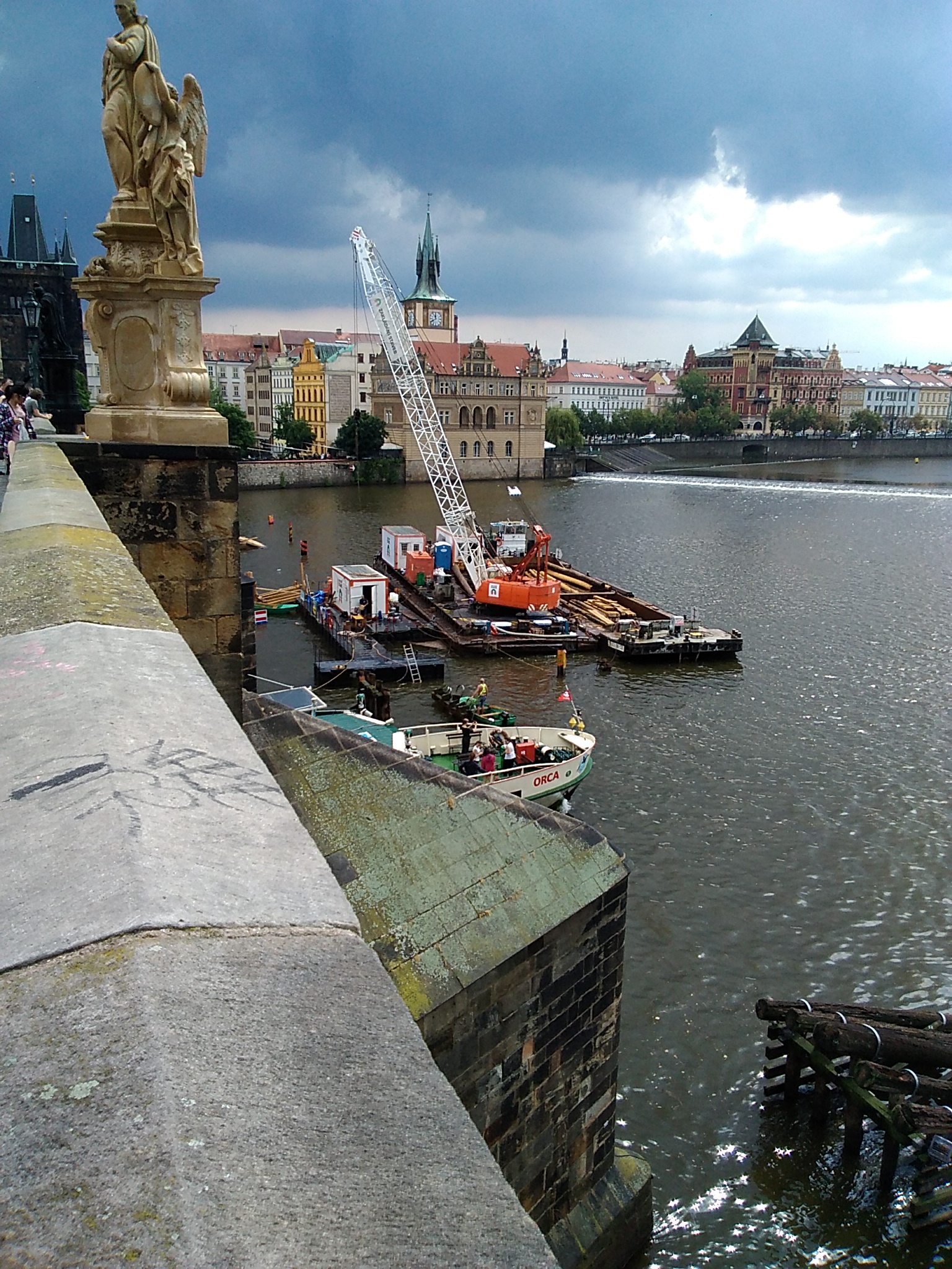 Tak jsem byl v hlavním městě, abych na "vlastní oči" :shock: spatřil Českou zeď nářků. Nepostřehl jsem po "nočním neodborném vyčištění" nějaká poškození oproti těm, která byla patrná i s nápisem, ale jsem "restaurační laik" :lol: A zažil jsem déšť který v krajině pod Řípem a nad Labem nějak letos nepamatuji, most aniž byl býval oset řepkou či kukuřicí také moc nevsakuje ;), asi ho budou rekonstrovat, jeřáb je už na to připraven, možná i vymění tu předtím posprejovanou zeď - odborně !!.. - foceno pomocí tbl HejAuwej.