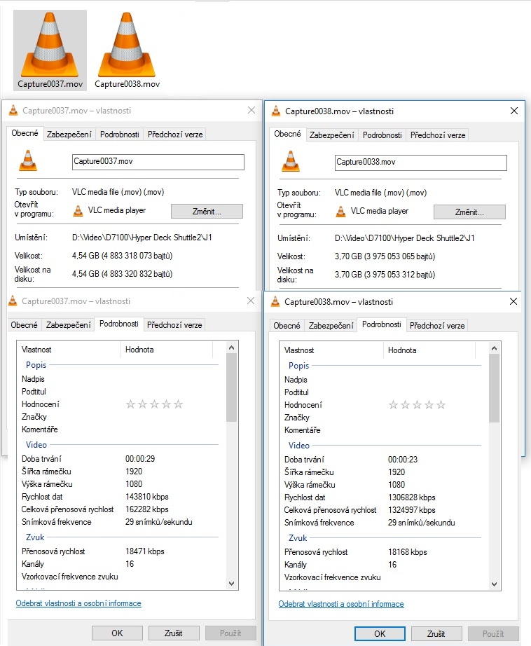 Nekomprimované video má datový tok se sedmimístným číslem, oba soubory jsou podobně dlouhé a odpovídá délce i velikost.