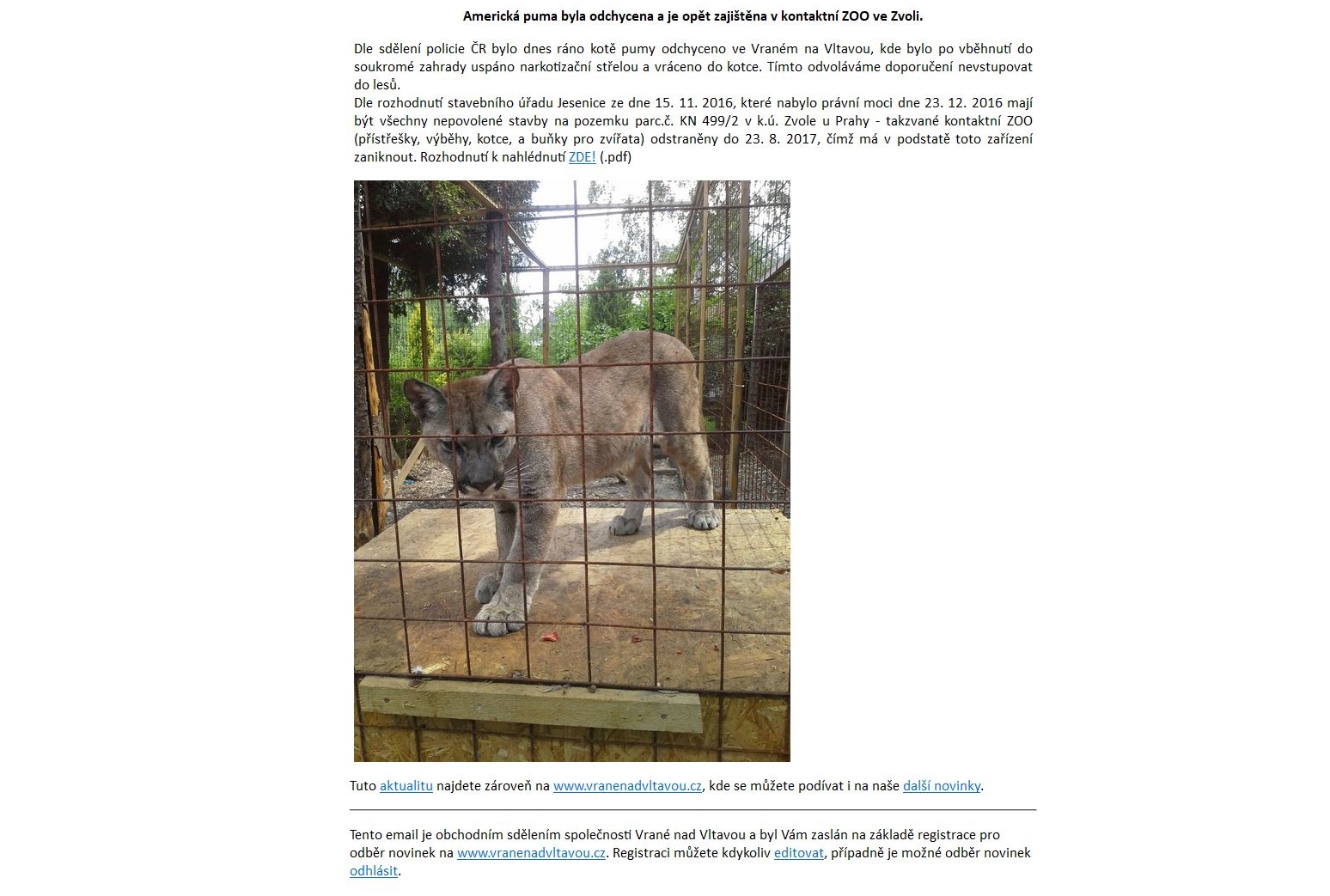 Zrovna dneska bylo ve zprávách že majitel této ZOO jí nemá zkolaudovanou a proto mu hrozí její zrušení. Možná to puma tušila a proto vzala roha. :lol: