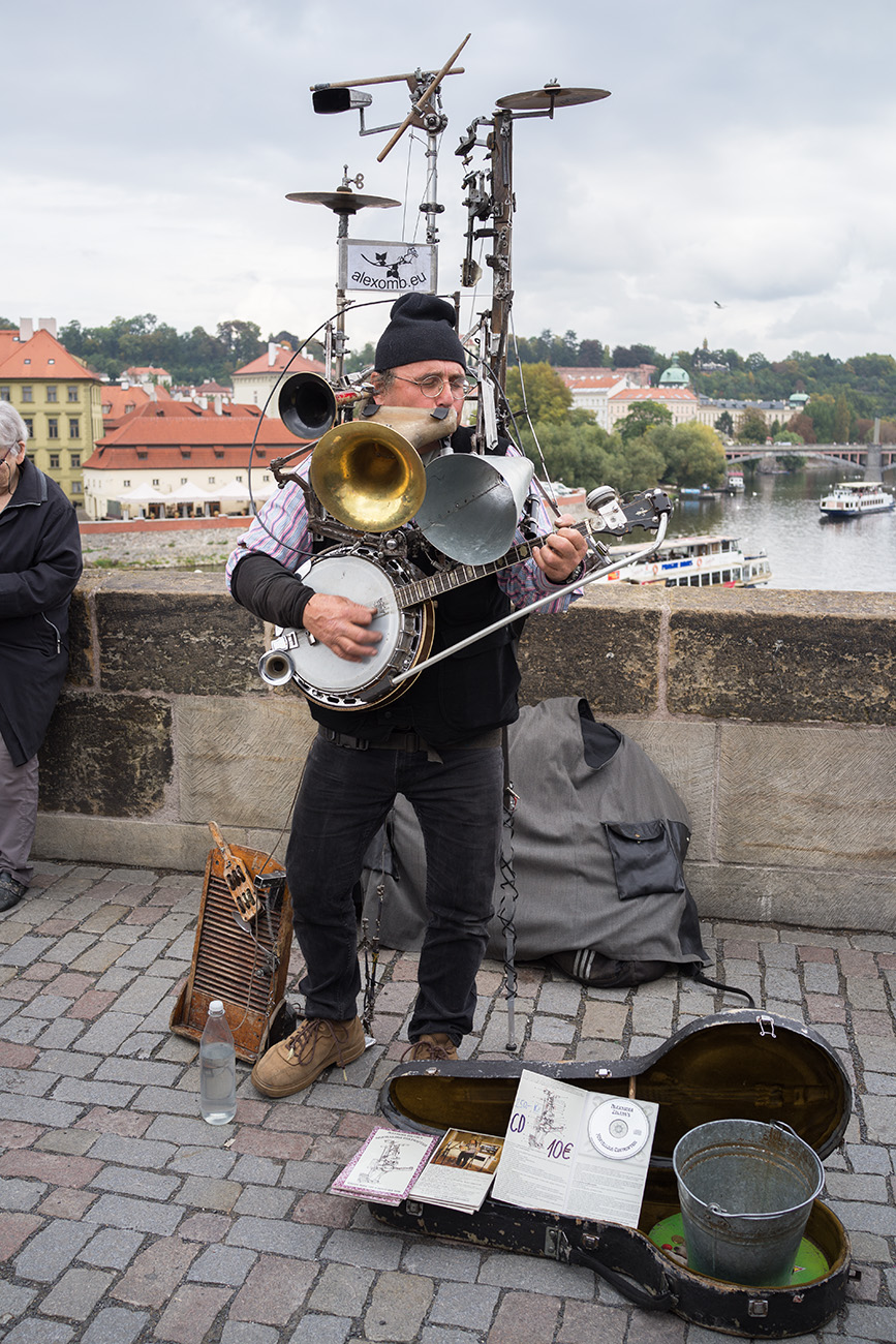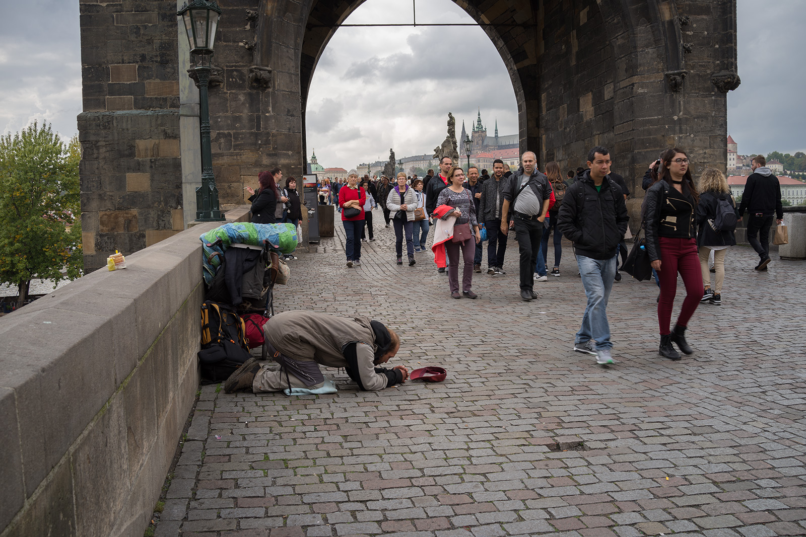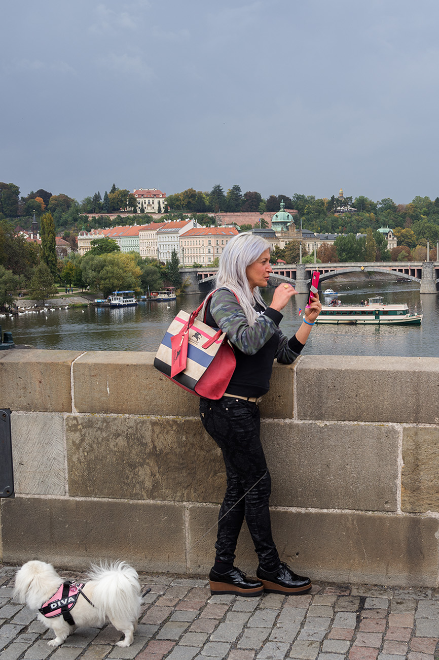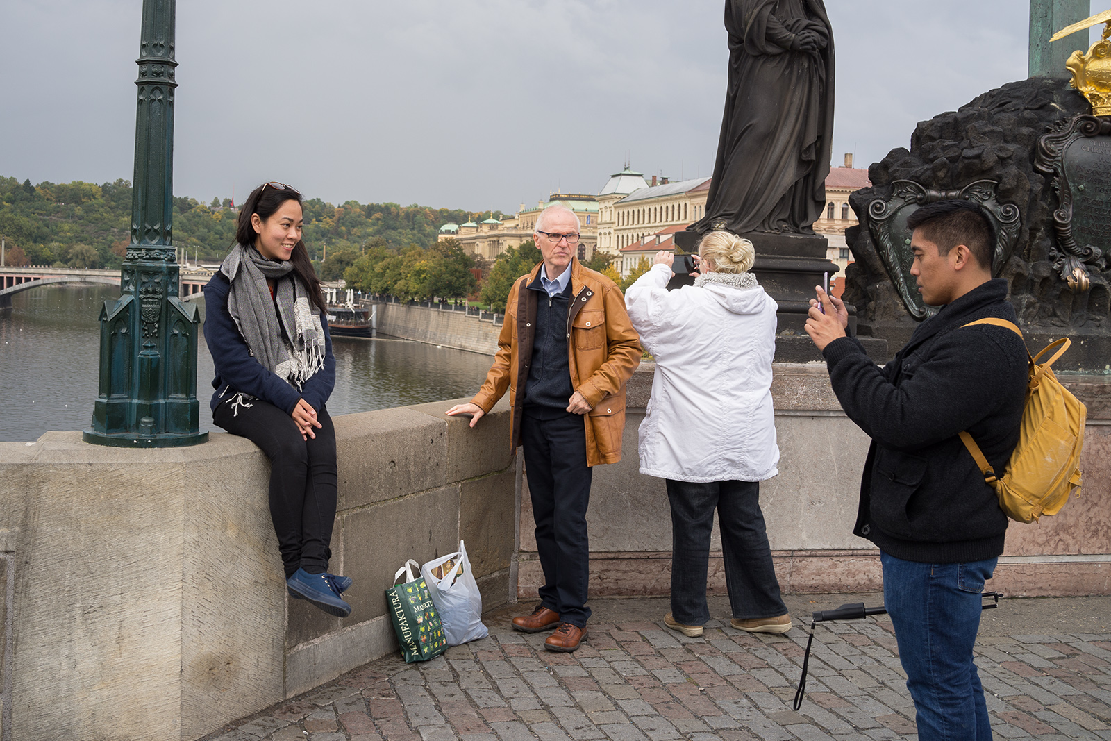 Na můj vkus trochu divnej to zvyk,posedávat na zábradlí - zdi, Karlova mostu a v jeho věku i dost divná a nebezpečná libůstka.Já na most raděj koukám odspodu od Vltavy.