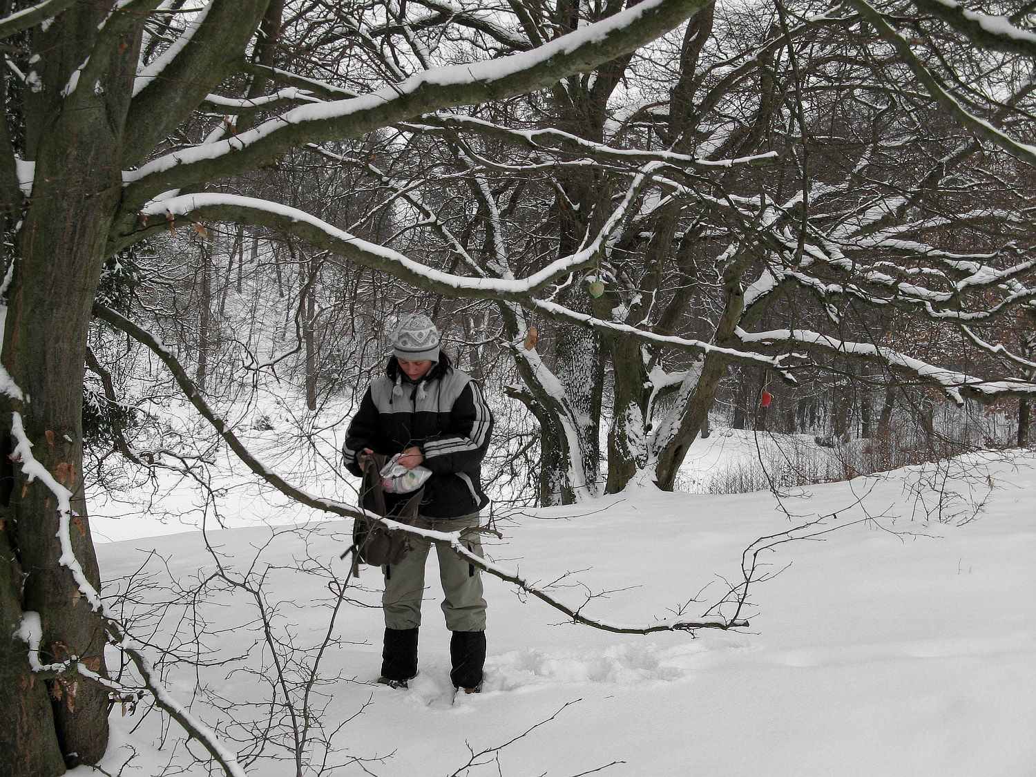 Zima zimovitá,ale už historická a rozvěšování krmení ptačíkům v "pustině" ...