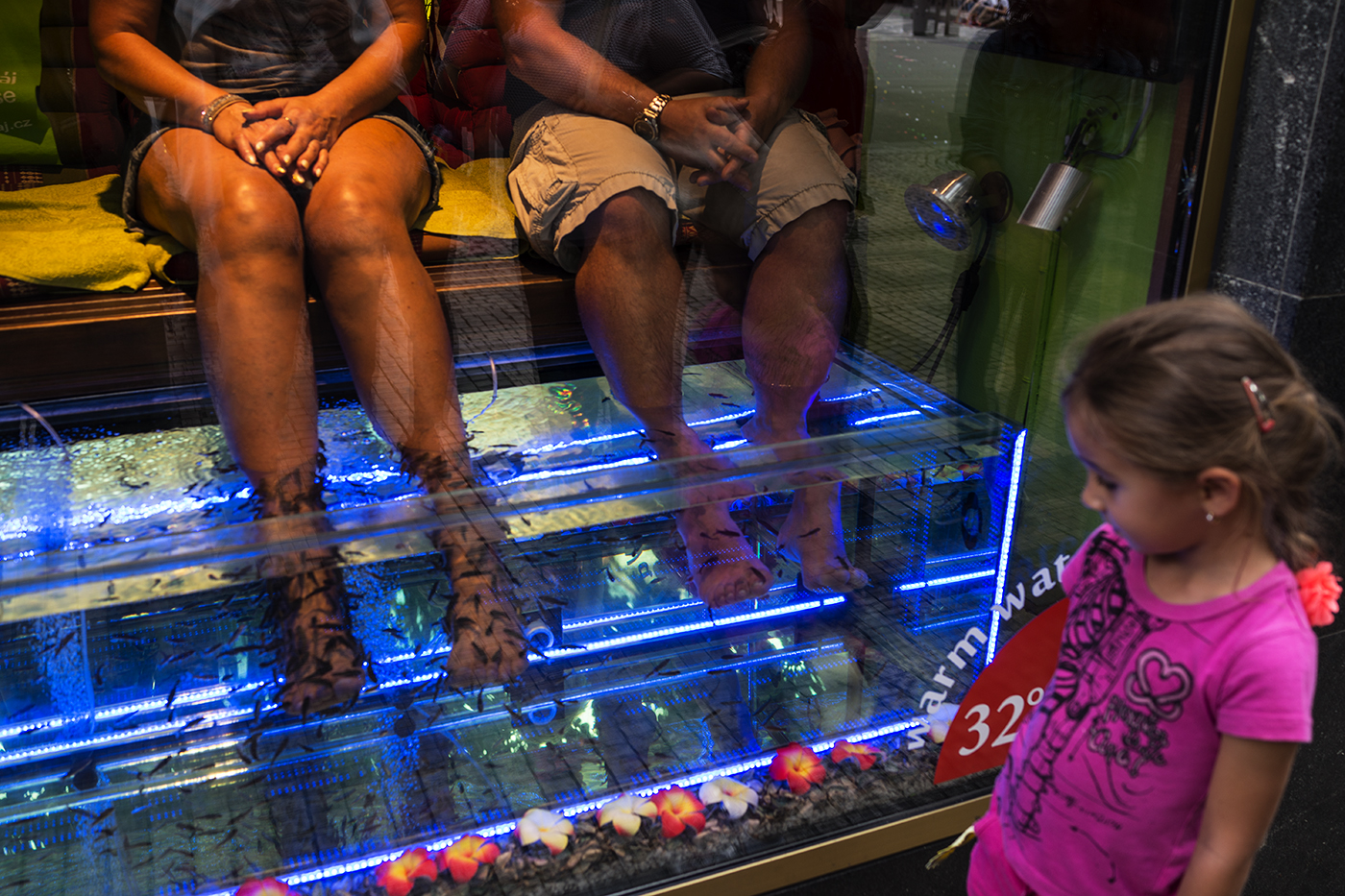 Přikládám jeden obrázek z Prahy. Je to zvláštní služba v Praze na Václaváku. Provádí tam thajské masáže a navíc toto okusování nohou. Když ty malé rybičky ( pirani ) dlouho nežerou, tak za chvilku těm důvěřivcům zbydou místo nohou jen ohlodané kosti! A to ještě za to platí a ne málo! :lol: :lol: :lol: