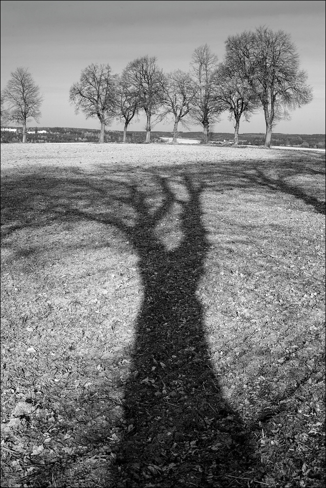 Dvě včerejší stromovky, ještě než se zatáhlo. Nokton 50 hodně zacloněný a červený filtr.