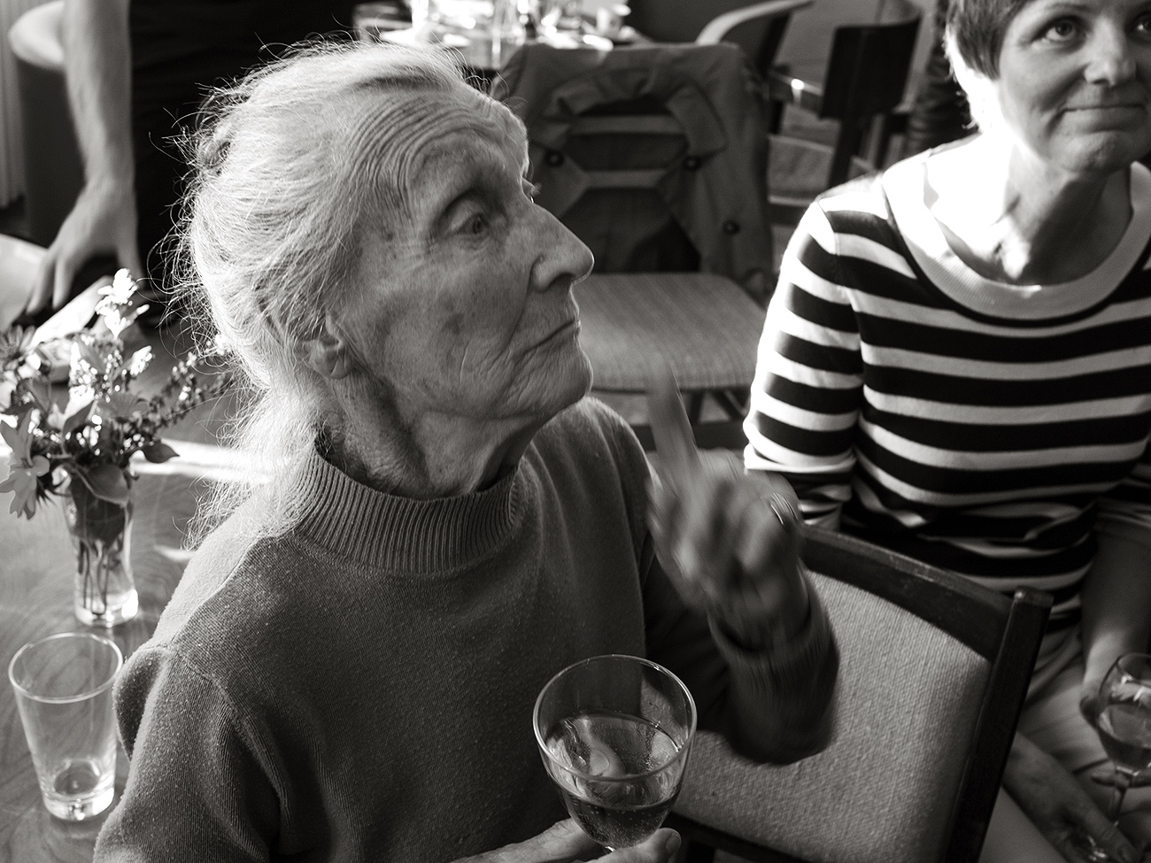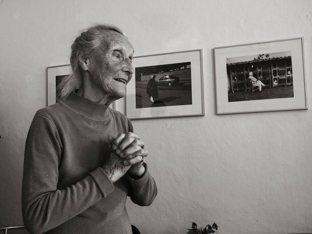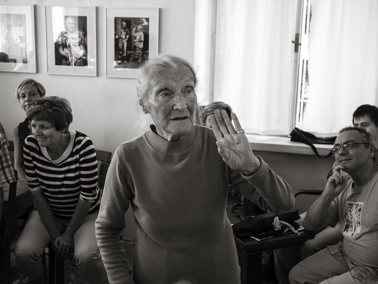 Ta starší paní je na jednom z jeho obrázků s názvem "Domluva". Obrázek je vidět na stěně na snímku "paní učitelka_4", hned za její hlavou. Byla též na vernisáži a celý večer, navzdory svému pokročilému věku velice příjemně oživila, hlavně svou vitalitou a perfektní pamětí.