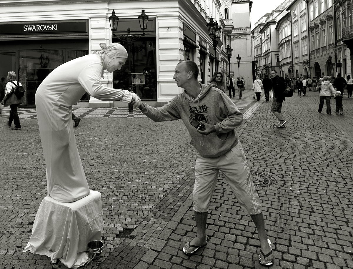 Při úklonu se alespoň, jinak nehybná socha, může podívat do nádobky, jak hluboko se vlastně má uklonit. Ale i zvuk cinknutí mince zkušenému uchu hodně napoví. :-) :-)