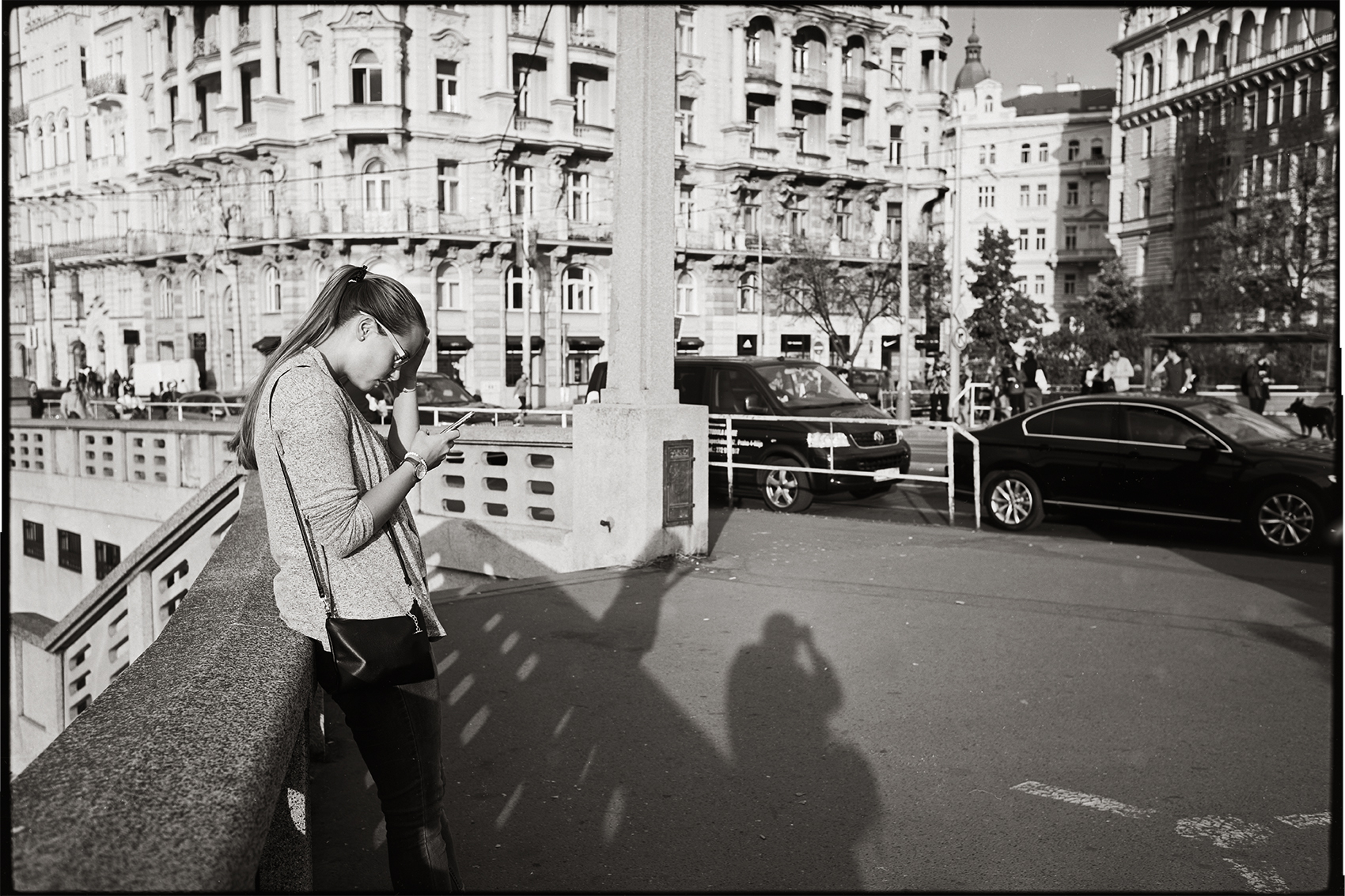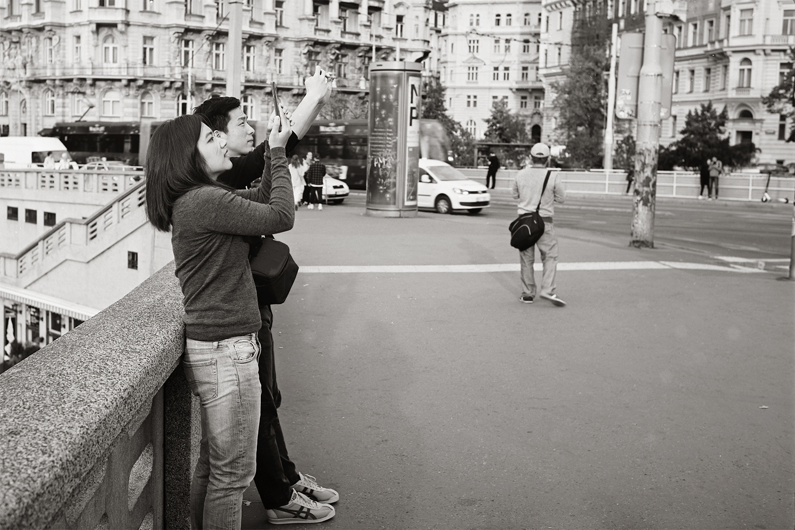 V těchto místech jsem ztratil víčko baterií a obě knoflíkové baterie z mé M6. Přišel jsem na to až asi před Palackýho mostem ( asi 300 m ), když mně při fotografování vklouzl prst do otvoru v M6 po těchto bateriích. Pochopitelně úprk zpět, tam kde mi ještě měření expozice fungovalo. Semafór nesemafór, s hlavou skloněnou, aby mně nic na chodníku neuteklo jsem letěl zpět. Vše se našlo i když se blýskavé baterie i s víčkem na chodníku pěkně vyjímaly. Cestou jsem přemýšlel, jak těžko budu shánět toto šroubovací víčko. :D