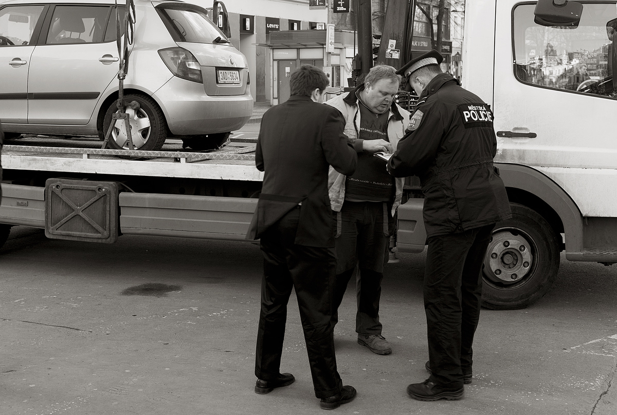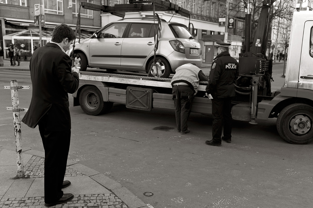 Jedno zaparkované auto ve Vodičkově ulici. Shluk lidí, tramvaje nejizdily, přijela odtahovka.