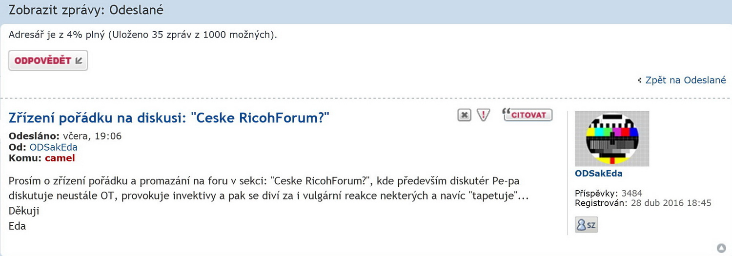 Bavilo mě to, i když jsem byl sám. Ale potom to začalo nějak žít. A zase objevil ON. Známe to všichni, nejdříve kamarád a sladké řeči, plné pochopení a rad, a končí to nadávkami až žalovatelnými : fašista , nácek a podobně, nemluvě o urážkách typu : čuráčí hlava ( pardon, muselo to zaznít) . A přehrál jsem si v hlavě scénář Foveonu. Jako přes kopírák. Pak mě ruply nervy a prostě jsem ulítl. Moje chyba. Ale chyba je i jinde. Jesliže Camel vymaže jen tapetování, tak je to málo. Vlastně nic. Myslím, že správce, či admin, by měl mít přehled, aspoň rámcový, kde se co děje. Pokud jej to s prominutím nezajímá, pak je to i tady odsouzeno k zániku. Na VŠECH, opakuji VŠECH vláknech se vědělo co se děje na Foveonu, nyní se ví co se děje na Ricohu !! A výsledek ? Sundání pár tapet!!! (y)
