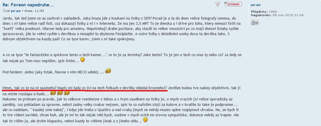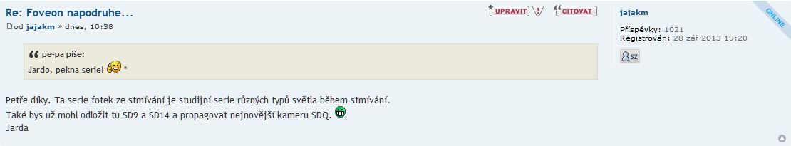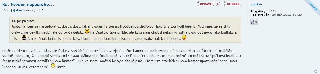 Petře nejde o to zda se mi tvoje fotky z SD9 líbí nebo ne. Samozřejmě si foť kamerou, na kterou máš zrovna chuť s ní fotit. Já to dělám stejně. Jde o to, že neznalý sledovatel SIGMA vlákna si u fotek např. z SD9 řekne "Proboha co to je za hrůzu? To má být ta špičková kvalita a fantastická jemnost detailů SIGMA kamer?". Nic ve zlém. Možná by bylo dobré psát u fotek ze starších SIGMA kamer upozornění např. typu "Foceno SIGMA veteránem". Jarda