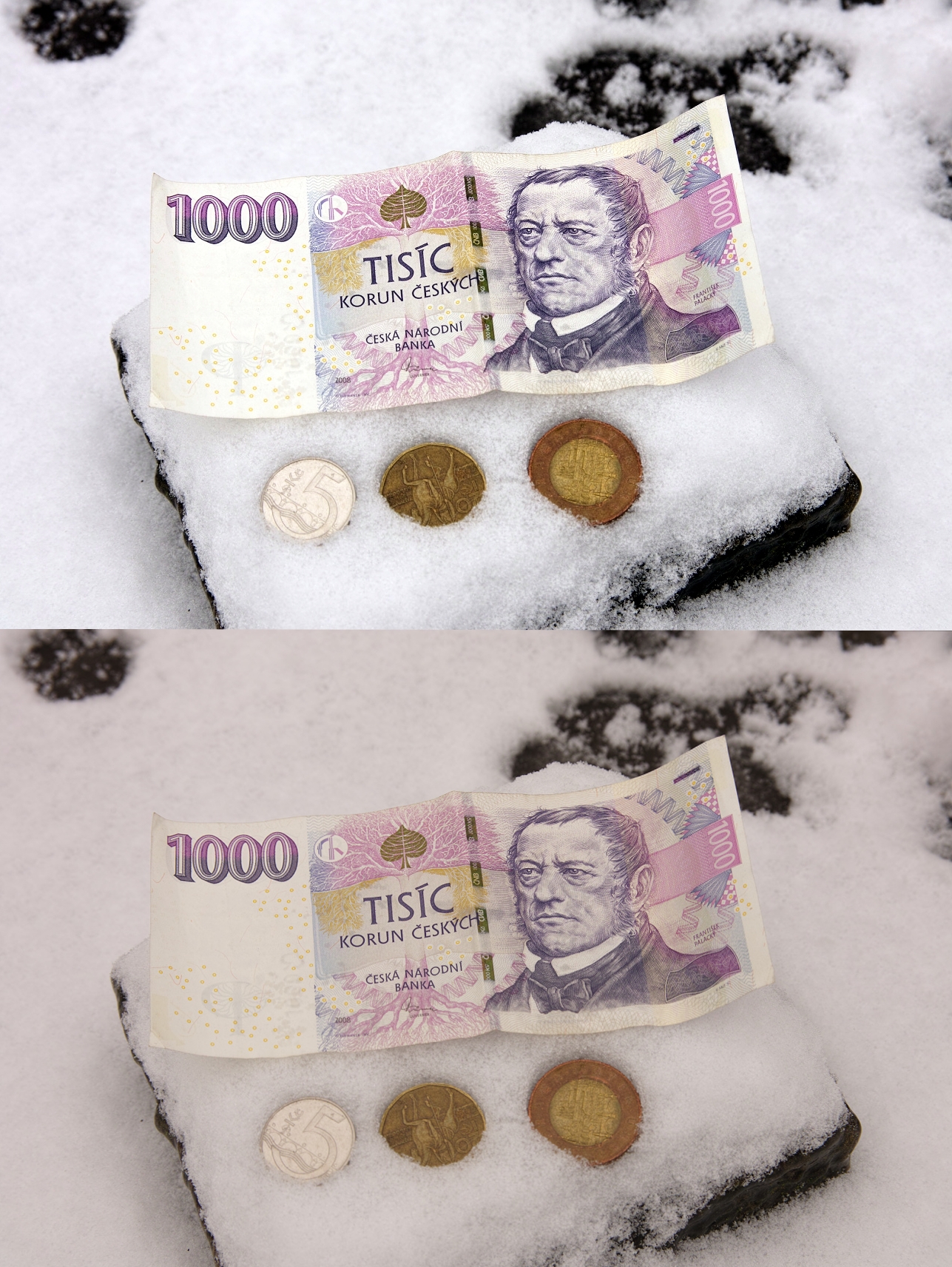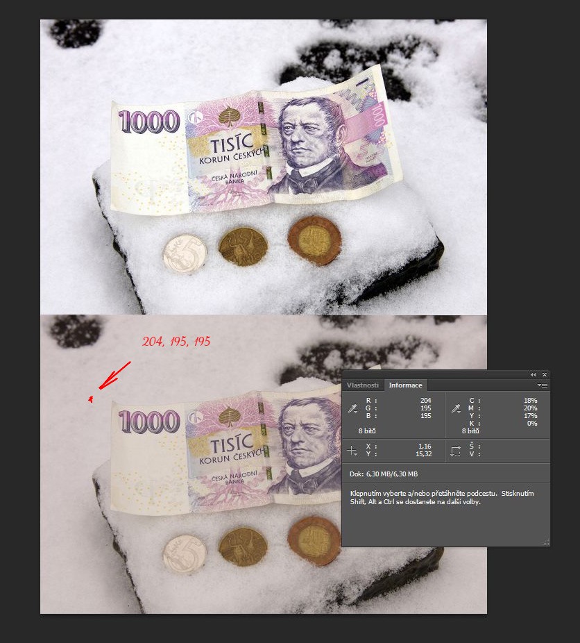 Pete, ten SD2988 byl pro porovnání špatný příklad (ze šedé tabulky). Dal jsem ho jenom pro porovnání, tam výrazně převažuje červená složka a zelená je nejslabší. Ta první ukázka, vyvážení podle sněhu, je mnohem přesnější, tam jsou RGB složky téměř úplně v rovnováze (na sněhu), odchylka je v různých místech max. 2 (0-255).