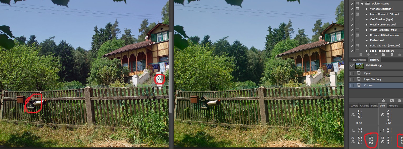 Dodatek: Teď jsem si všiml, že hodnoty RGB na tom bílém pilíři u schodiště (SDIM9075) jsou 244, 238, 231, což by vzhledem k všudepřítomné blízké zelené vegetaci, trávou počínaje, mohlo docela reálně odrážet skutečnost.