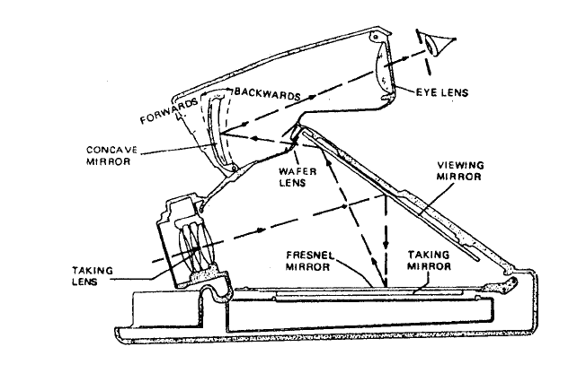 Je to daleko složitější. Přes vstupní čočku hledáčku to jde na parabolické zrcátko, potom přes kolimační čočku na hlavní zrcadlo, pak na celoplošnou Fresnelovu čočku, pak zpět na hlavní zrcadlo a přes čtyřčlenný objektiv ven. Speciální Fresnelova čočka má za úkol, dostat do hledáčku odražený, rovnoměrně osvětlený obraz foceného předmětu (běžné zrcadlo by to nezvládlo) a zajistit jeho správné zaostření.