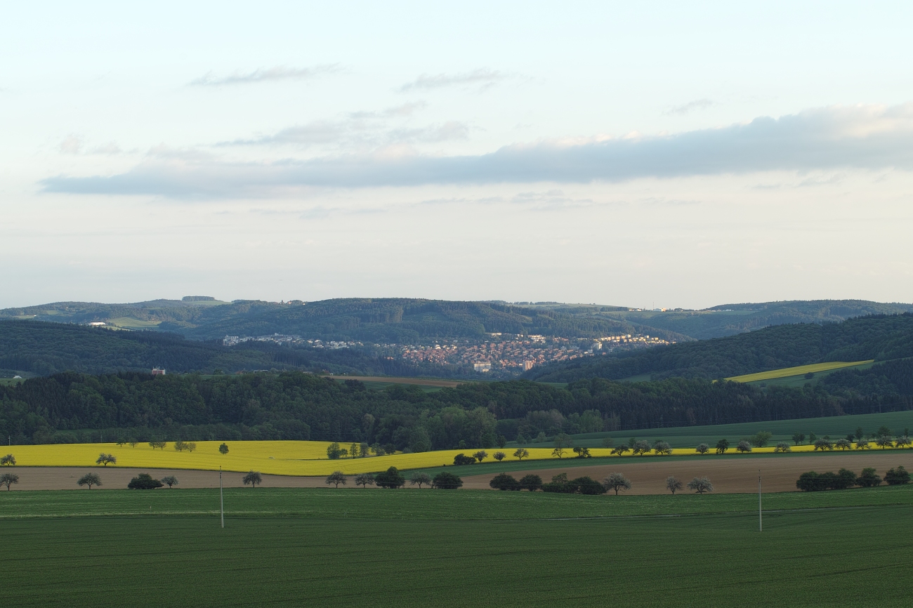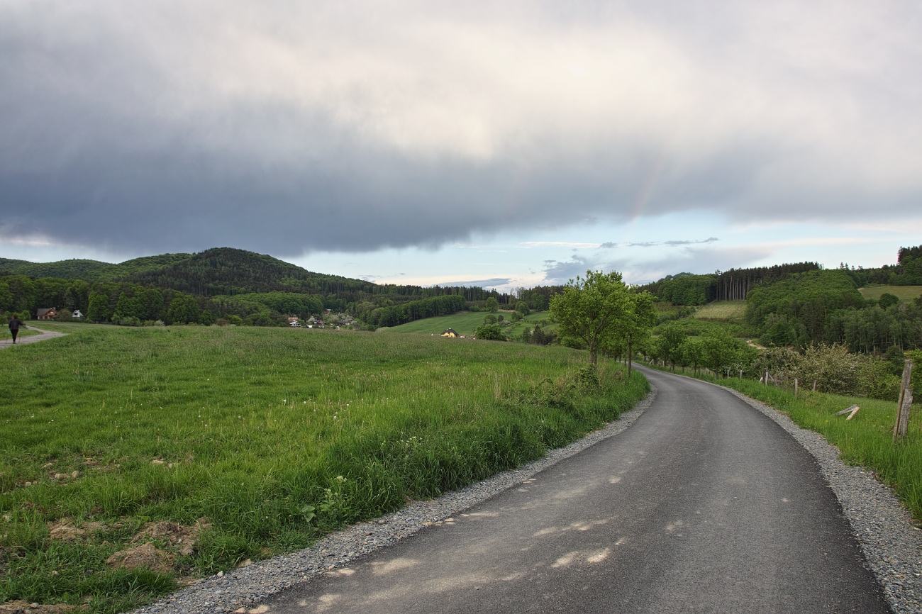 Úterní pobouřková (pršelo jenom nad lesem), na poslední chvíli jsem v zrcátku uviděl kousek duhy, ale než jsem zastavil atd., už z ní skoro nic nezbylo (y).