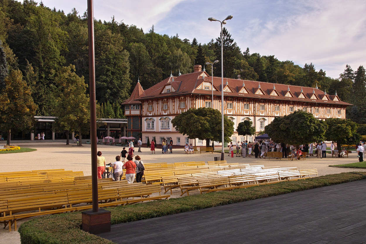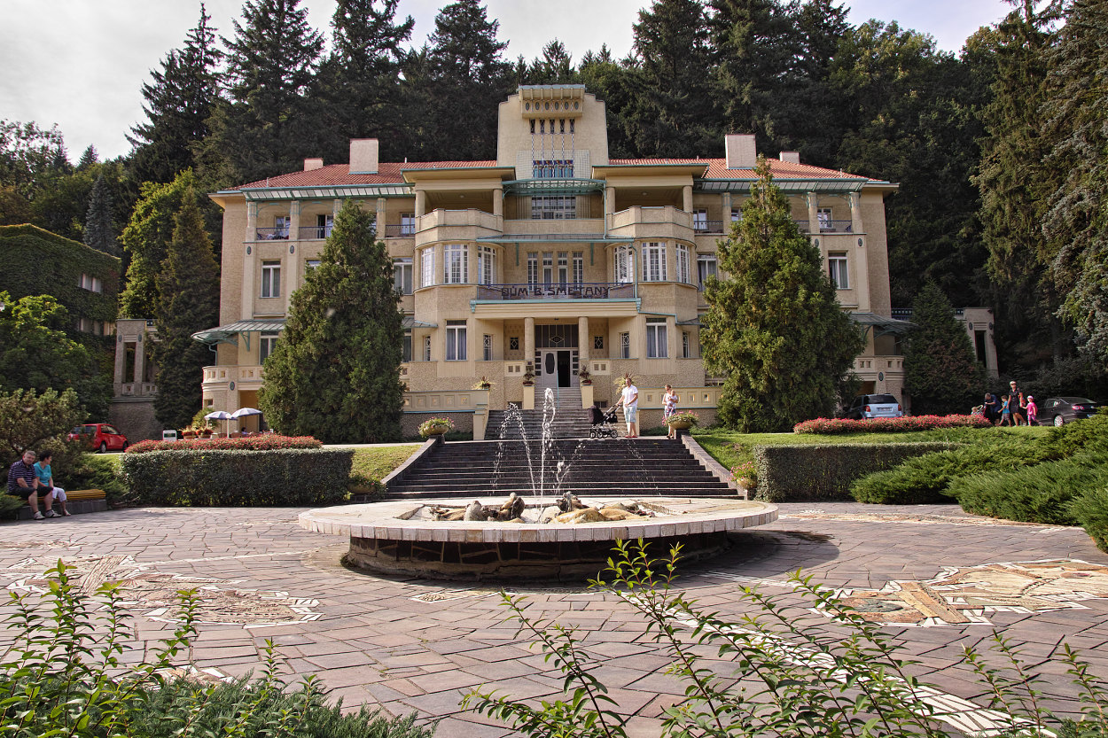 Dům Bedřicha Smetany v Luhačovicích. Narůžovělý asfalt mi nevadí, mnohem víc mi vadí, co to udělá se zbytkem fotky, když se pokusím tu cestu nějak "normalizovat" ;) . A taky jsem to nijak nerovnal, bo pokaždé to ukradlo kousek toho pána na lavičce a to bych mu přece nemohl udělat... :D