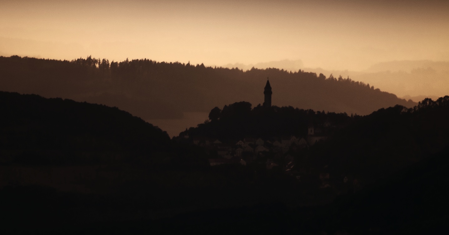Pohled na Štramberk na cestě z Pusteven na Radhošť a západovka nad Radhoštěm