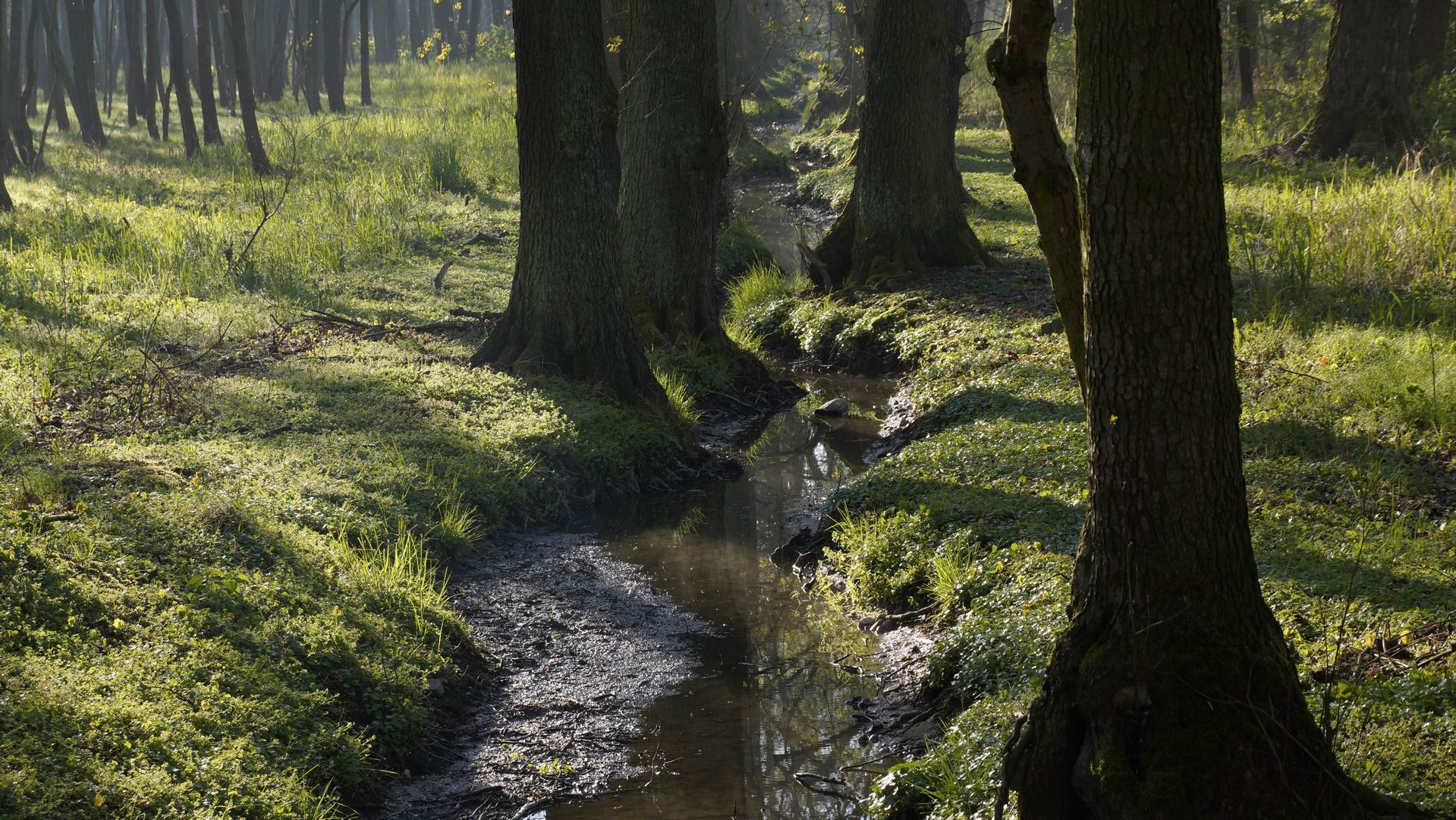 Potok, spíše odtok z rybníku Námětek u Vodňan, klikatící se mezi stromy