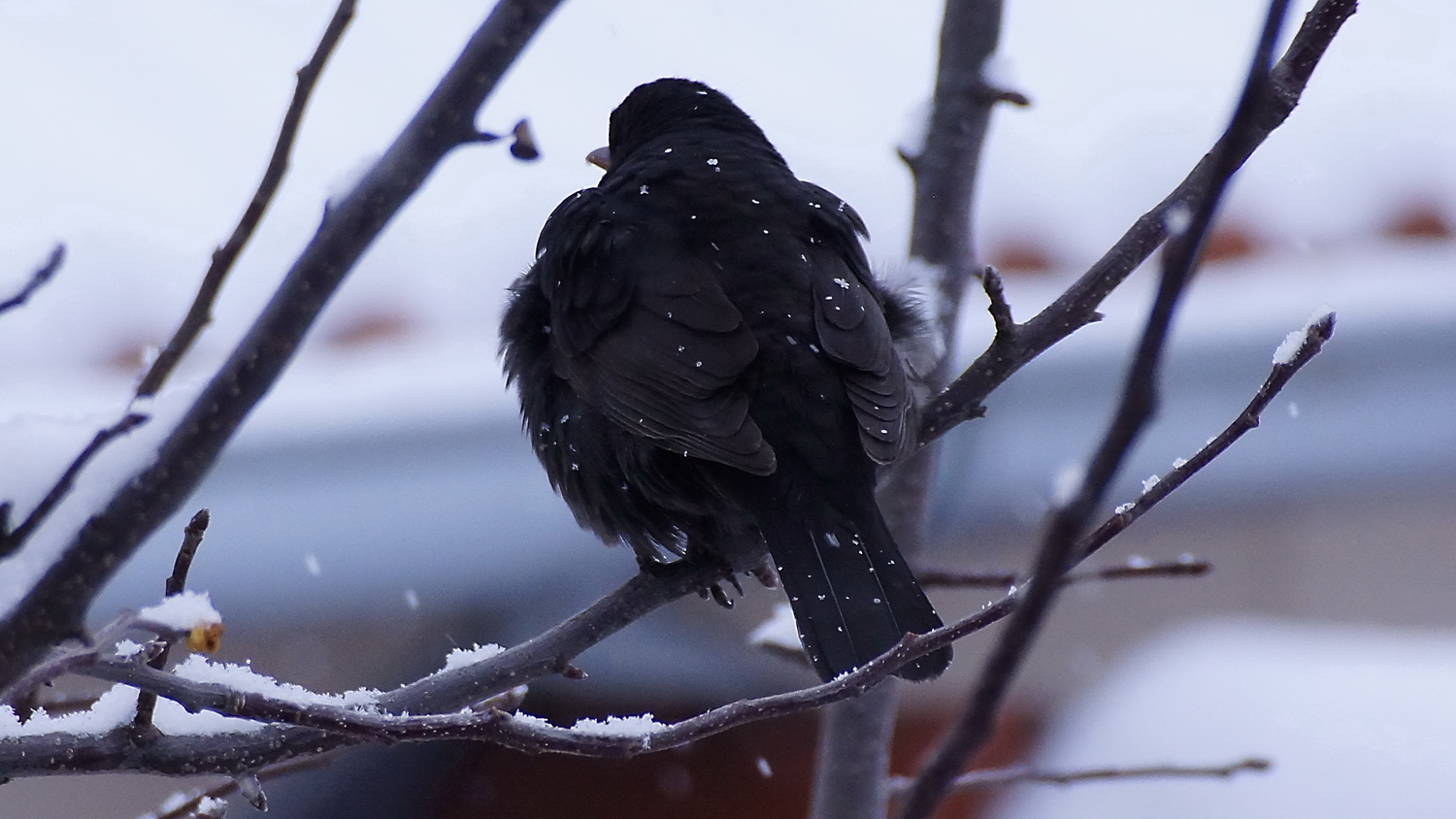 Zmrzlej Kos v černém kabátě s bílými puntíky ;) a ustaraná pí Kosová - přes dvojité sklo okna pokoje a z ruky na 250mm/APS-C (375mm/FF):