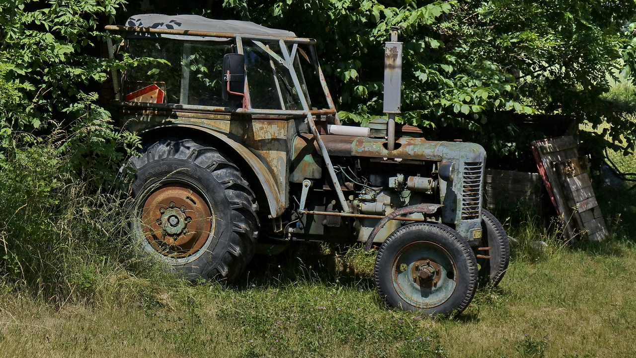 Ten traktor - Super má SPZ a vzadu za oknem moderní trojúhelník, kterým se musí označovat pomalu jedoucí vozidla a také není zarostlý v trávě a tak jen předpokládám na základě těchto pouze indícií, že je stále v provozu.