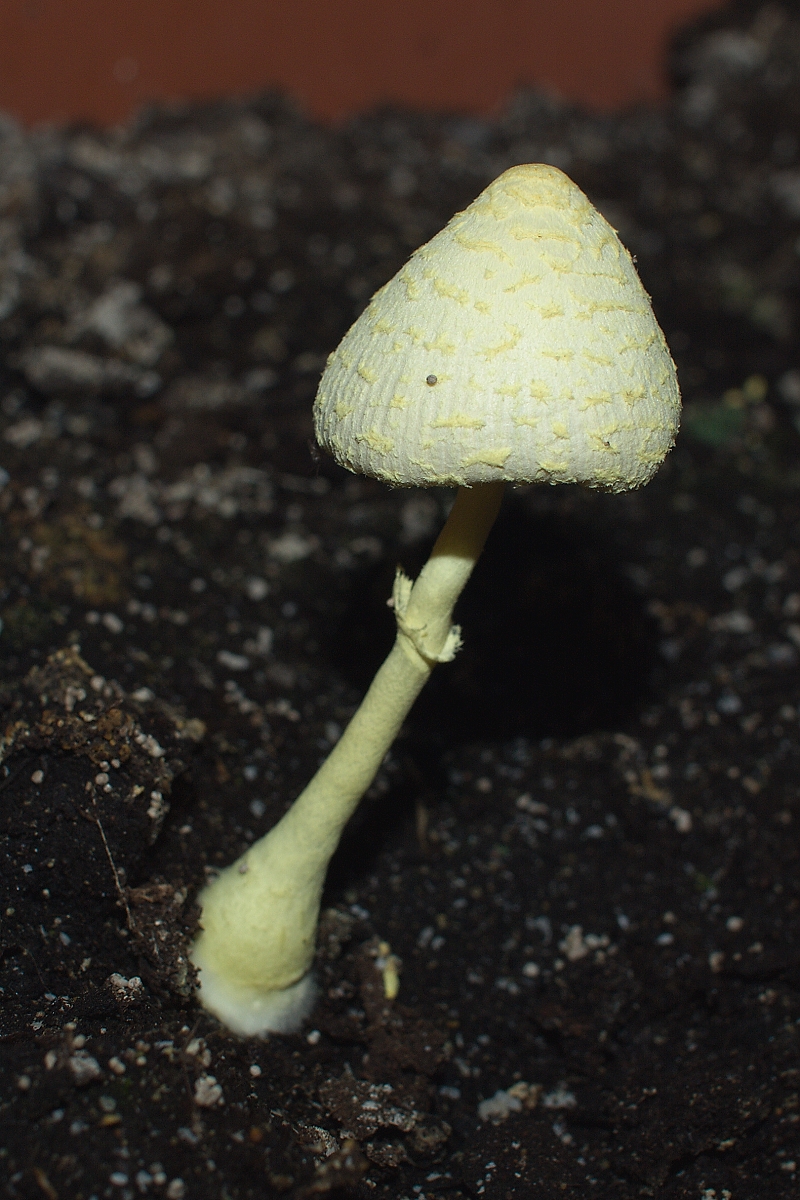je to jedna z častých hub právě v květináčích, případně ve sklenících a foliovnících. Jmenuje se bedla cibulkotřenná (Leucocoprinus birnbaumii). Jedlá není, ale na druhé straně ani neškodí rostlinám v květináči...
