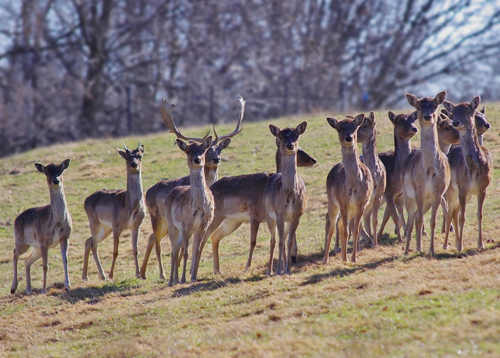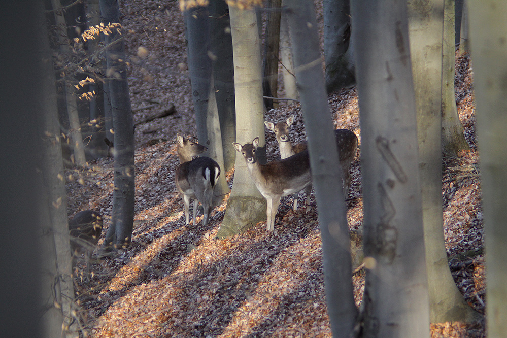 to Dluhoš, daňci byli ve vzdálenosti asi 70m.Já v lese a před sebou ve vzálenosti 2m drátěný plot.Přestože jsou chováni v oboře, jsou to mimořádně plachá zvířata, nakonec je to z fotky vidět, jak jsou ve střehu.