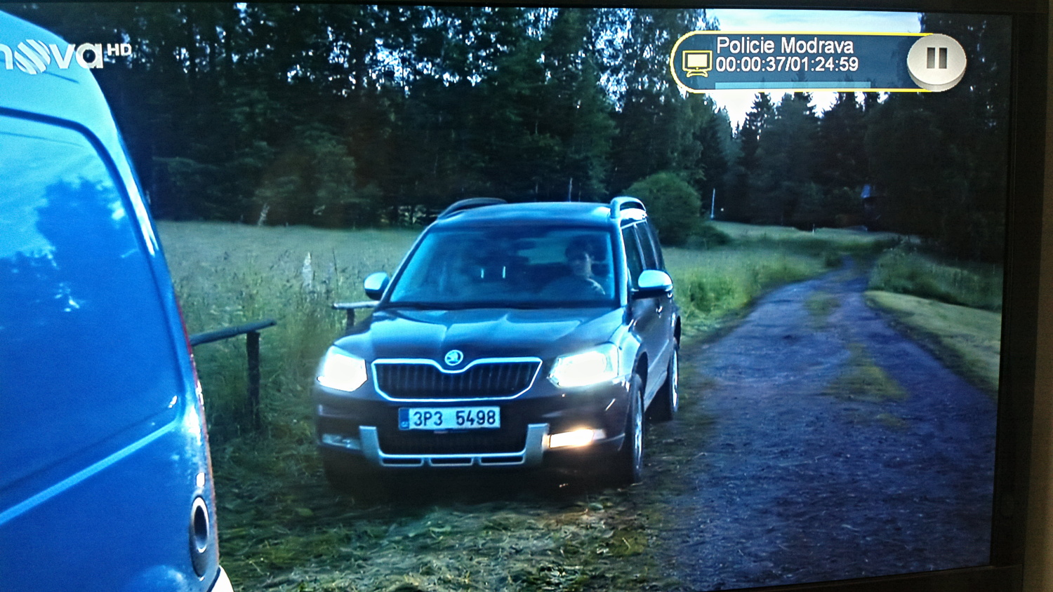Ve 23. vteřině vyjíždí vyšetřovatelka z lesa v autě Škoda Yeti model 2012 SPZ 3P3 54 98