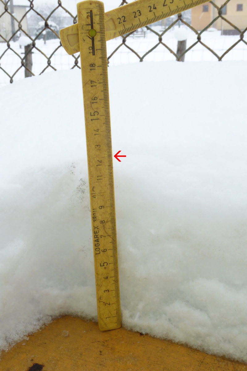 Nepravidelné hlášení o stavu sněhu na Liščině. Měřeno provizorní sněhoměrnou latí (colstokem), pro netechniky https://en.wiktionary.org/wiki/colstok