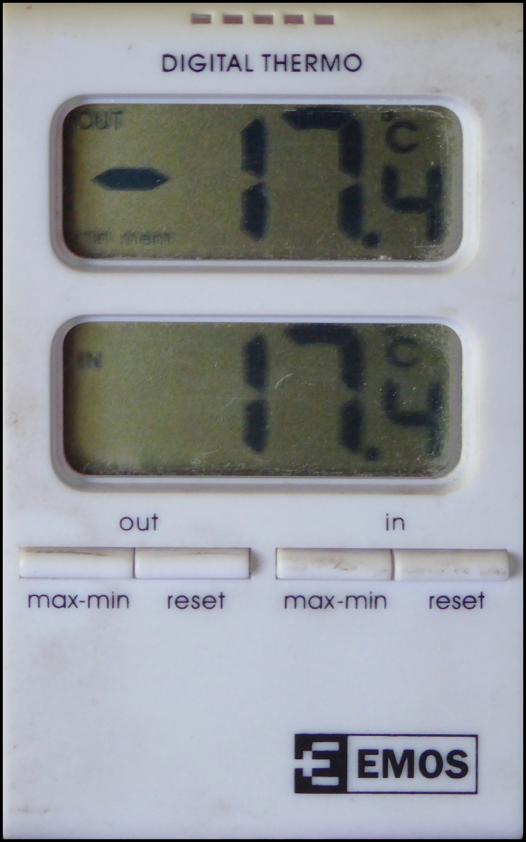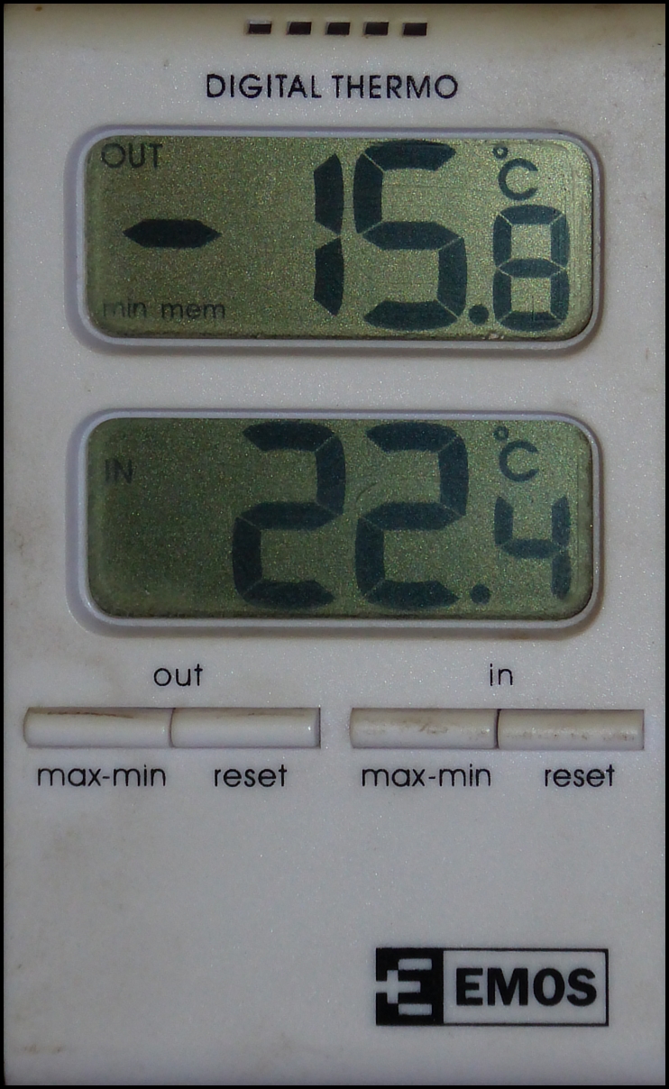 Přeji příjemné poledne, nám tady k obědu stoupla teplota na -8,4°C, ale když jsem ráno kolem půl deváté přijel, tak žádné teplo ani v chalupě a v noci tady byla pěkná kosa a to má přituhnout.