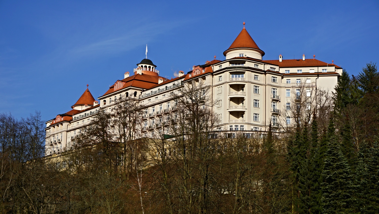 Hotel byl postaven v letech 1910 až 1912 na výšině nad lázeňskou částí Karlových Varů na lokalitě zvané Na čihadle. Stavbu financoval karlovarský bankéř a podnikatel Alfred Schwalb. Pro stavbu samotnou si pozval známého francouzského inženýra Ernsta Hebrarda, který se proslavil stavbami v řecké Soluni a Vietnamské Hanoji (tehdy Francouzská Indočína).