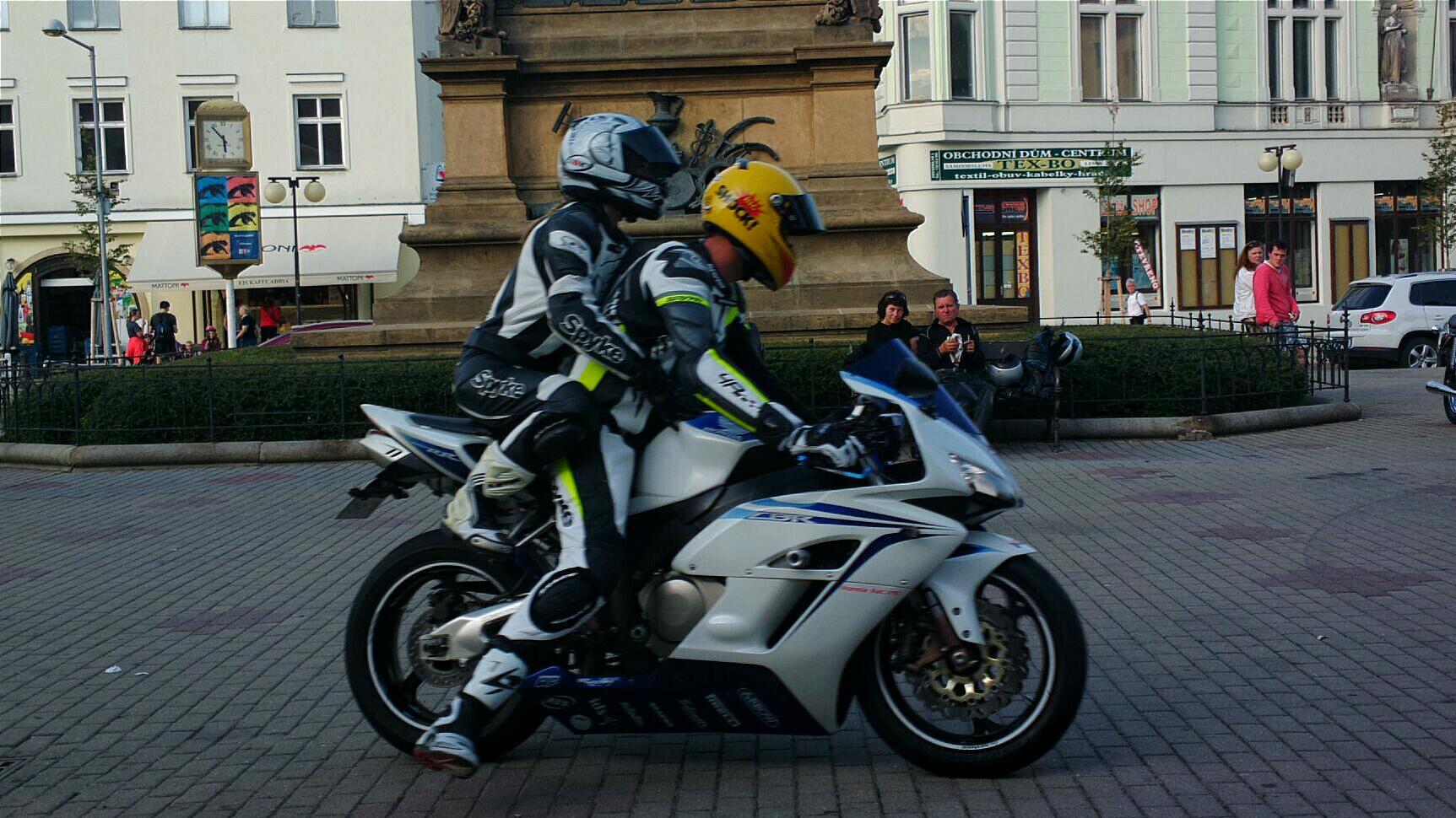 Seděli jsem na lavičce a motorkář nám málem přejel nohy, :)