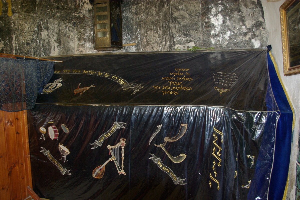 Na fotce vidíte místo posledního spočinutí krále Davida. Tady se na jeho sarkofág dívaji muži, no a za tou dřevěnnou stěnou, vlevo, ženy. Nechali jim aspoň jeho nohy. Při tak závažných nábožensky laděných okamžicích, musí mít muži na hlavě pokrývku, ženy prostovlasé. A muži i ženy musí být odděleni. Platí to i pro turisty.