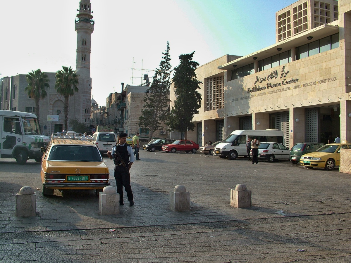 Jeden obrázek z náměstí před Betlémským chrámem Narození Páně. Hlídá nás palestinský policista, aby se nám nic nestalo. Jiného příjmu, než z turistiky, tam chudáci také nemají (y)