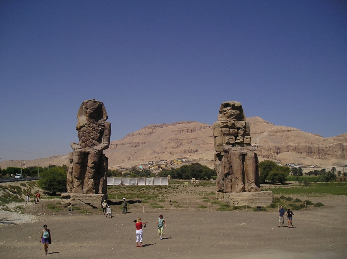 Memnonovy kolosy, sochy Amenhotepa III. jsou vysoké 16 a cosi metrů podstavec má kolem dvou metrů. Koruny se ztratily, jinak by byly sochy přes 20 metrů vysoké. V kameni jsou trhliny, které vznikly při zemětřasu v roce 27 před Kristem. Za východu slunce se vlivem roztažnosti, části kamenu o sebe třou a vyluzují zvuky, tak se jim často říká zpívající kolosy.